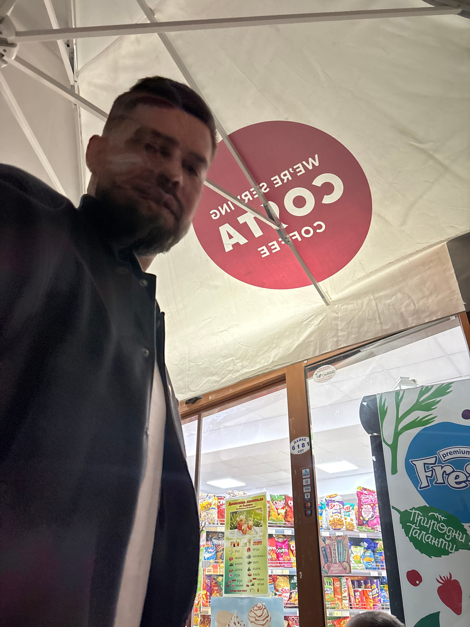 The image shows a man with a beard and dark hair standing under a Costa Coffee branded tent in front of a shop. The shop has a refrigerator section visible with a variety of snacks and drinks. The loc…read more