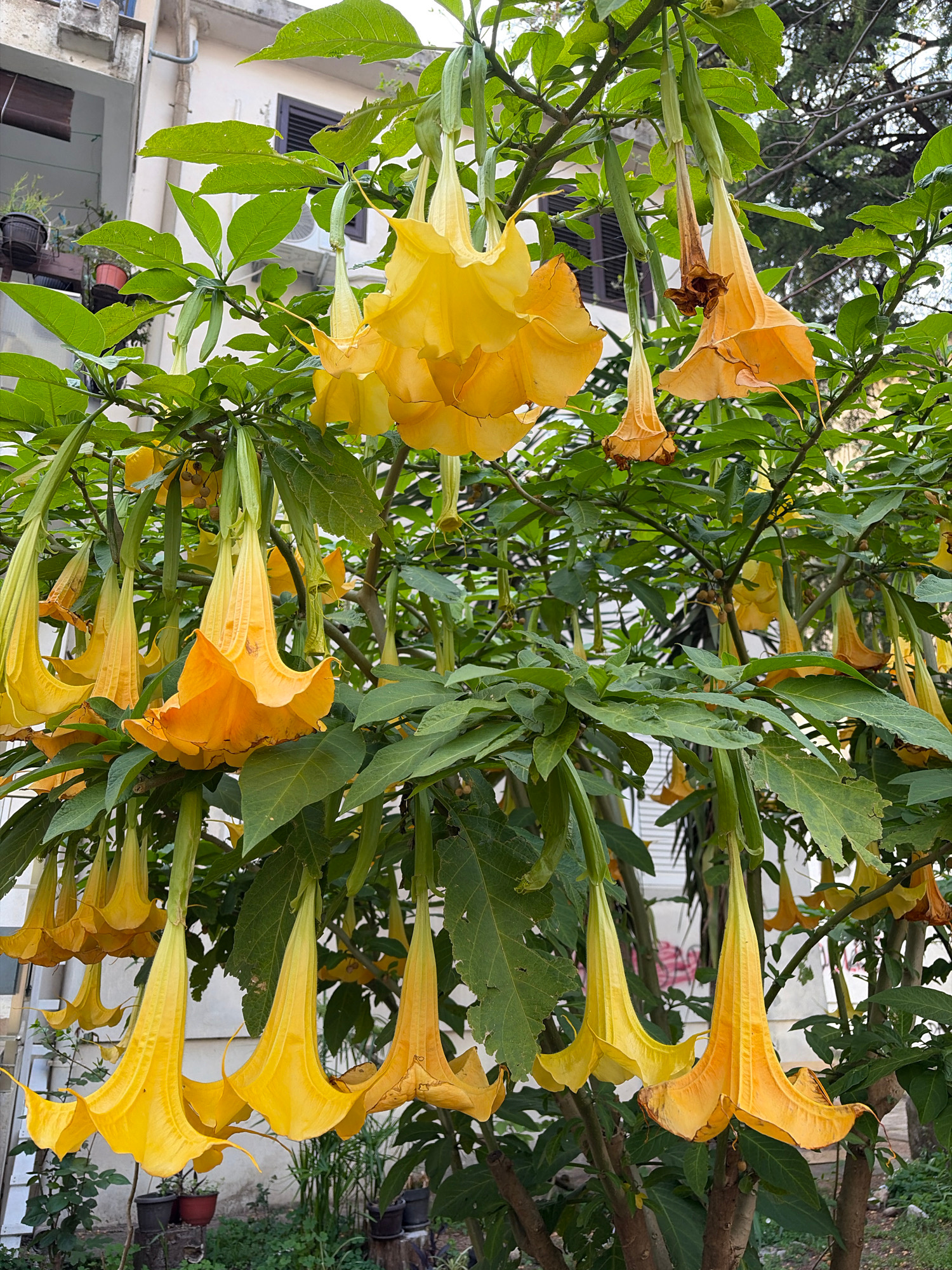 A close-up shot shows a blooming Brugmansia tree, also known as angel's trumpet, with large, yellow, trumpet-shaped flowers hanging downwards. The tree is dense with green leaves and blossoms in vario…read more
