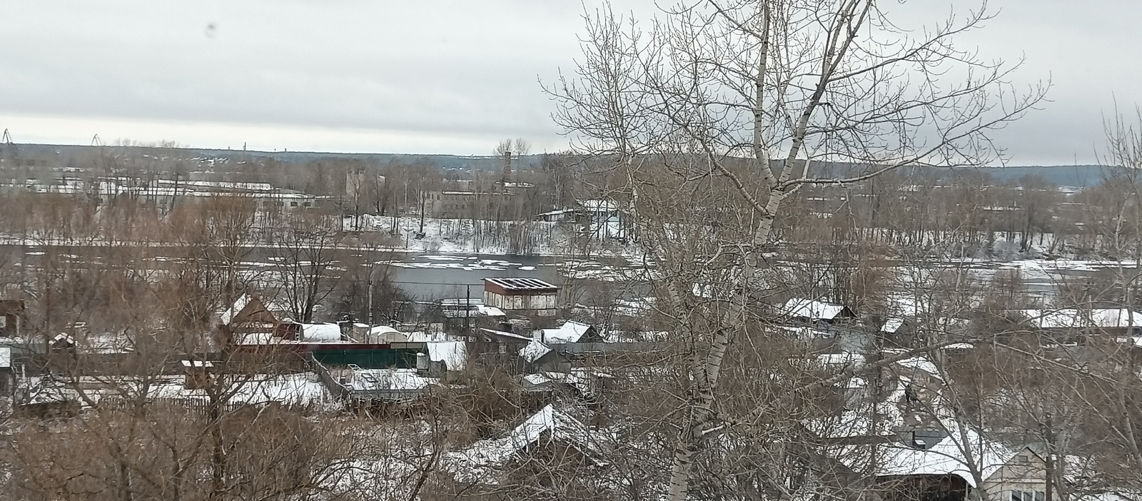 A winter landscape shows a river running through a town, with the roofs of buildings covered in snow. The sky is overcast and gray. The scene is dominated by bare trees in the foreground, with buildin…read more