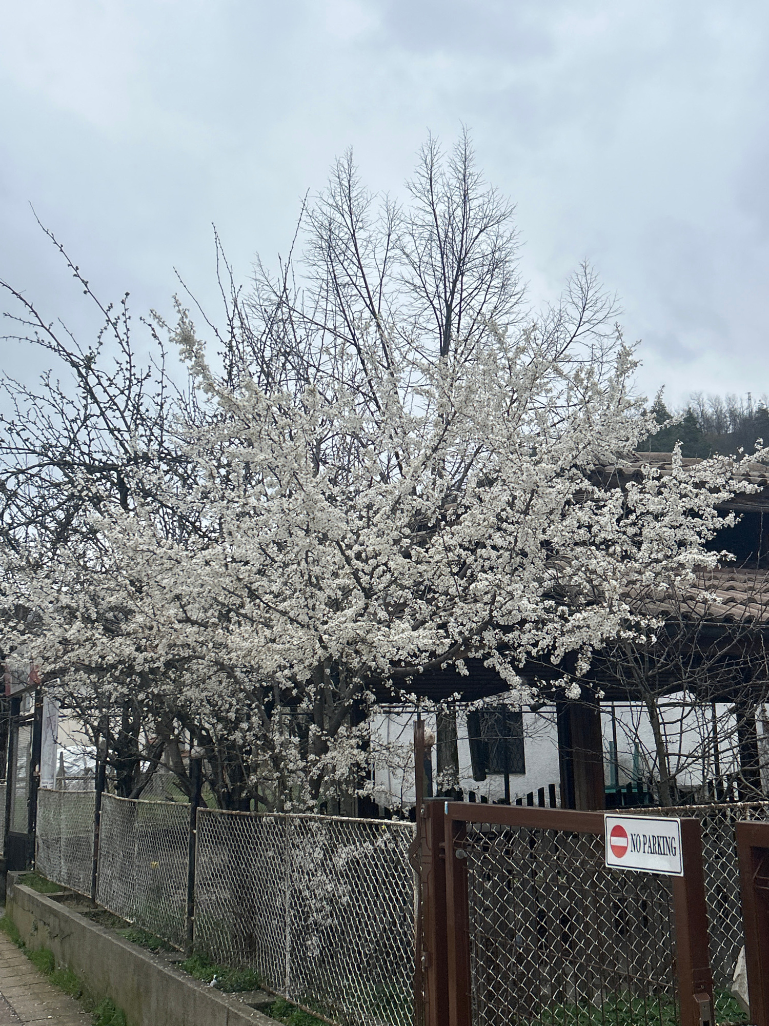 The image shows a blossoming tree with white flowers in Zlatograd, Bulgaria. The tree stands near a fence with a "No Parking" sign attached to it. In the background is a building with white walls and…read more