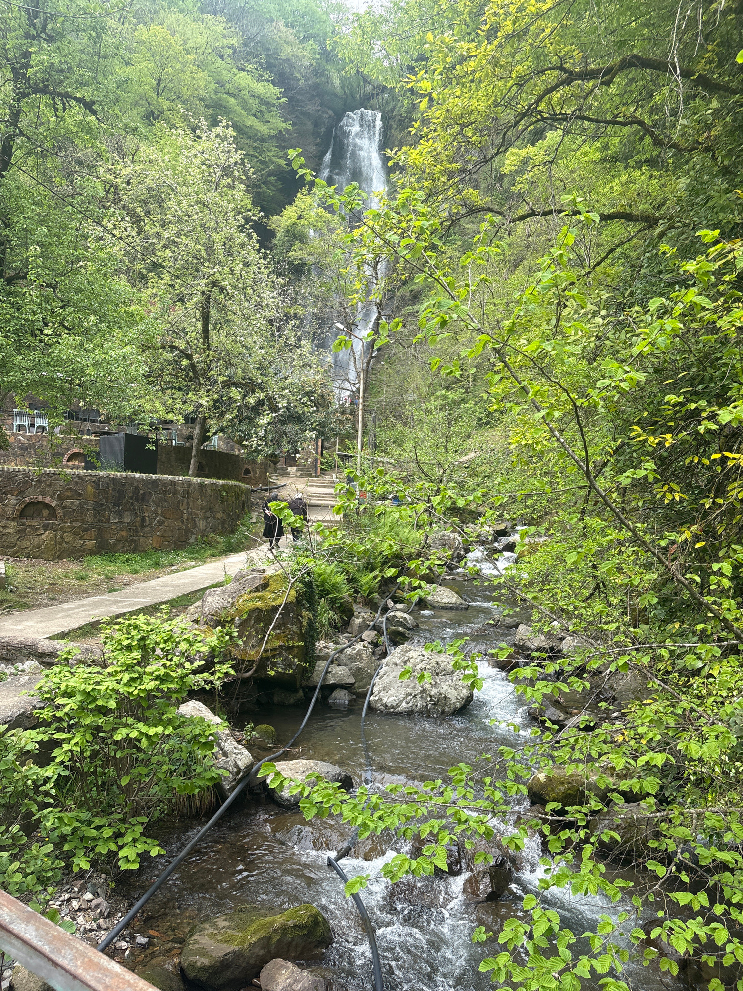 A medium-angle, eye-level shot shows Kveda Makhuntseti Waterfall and its immediate surroundings in Kveda Makhuntseti, Georgia. The landscape is lush, with abundant greenery from trees and plants, primβ¦read more