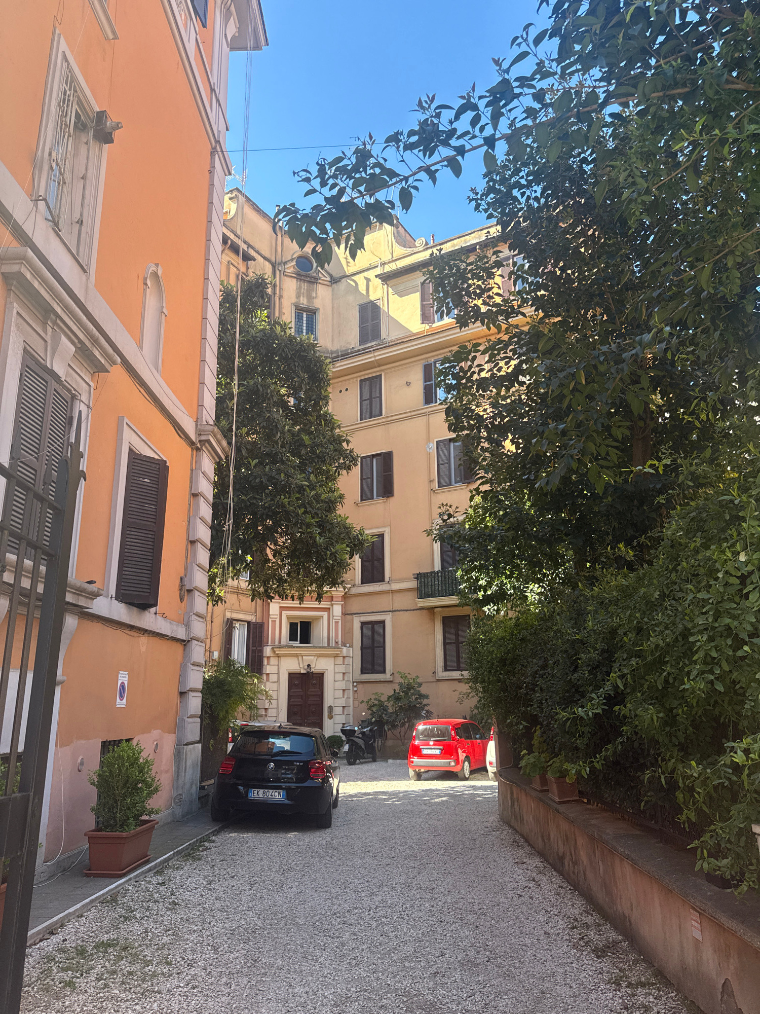 The image depicts a narrow street in Rome, Italy, viewed from a low angle, looking up at the buildings and sky. The buildings are painted in muted yellow and orange tones, with multiple stories of win…read more