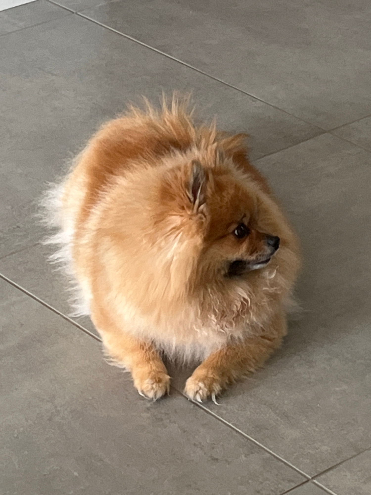 An overhead, slightly angled shot captures a fluffy, light brown dog lying on a grey tiled floor. The dog, likely a Pomeranian or a similar small spitz-type breed, is curled into an oval shape, primar…read more