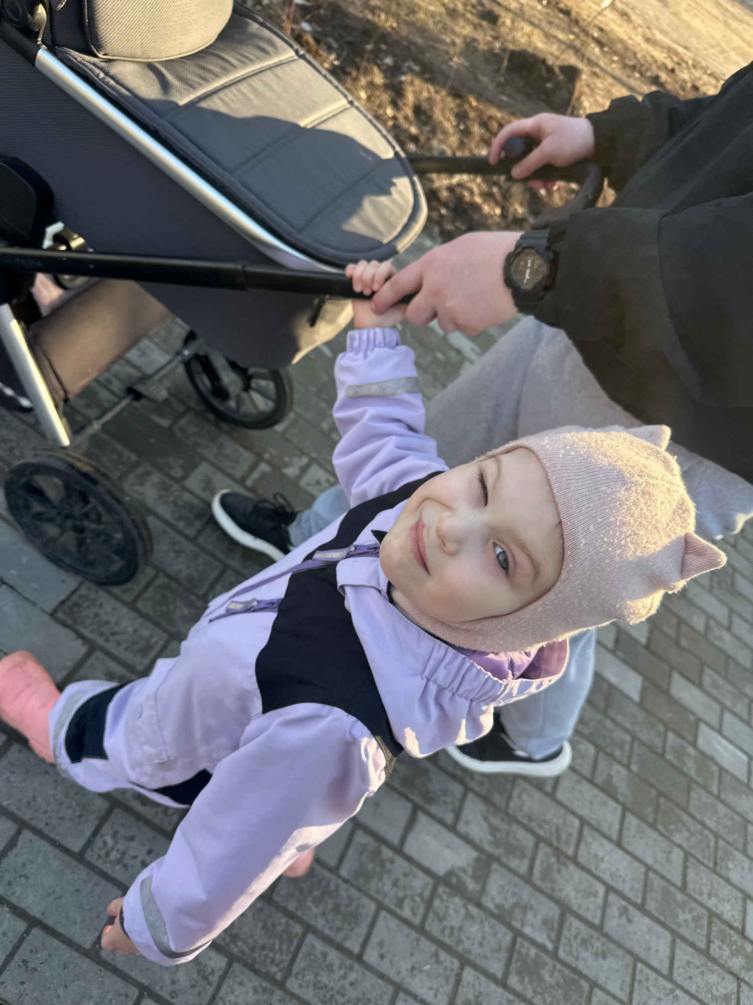 A young child winks at the camera while standing on a paved surface near a stroller being pushed by an adult. The child is wearing a light purple jacket, a pink hat with pointed ears, and pink boots.…read more