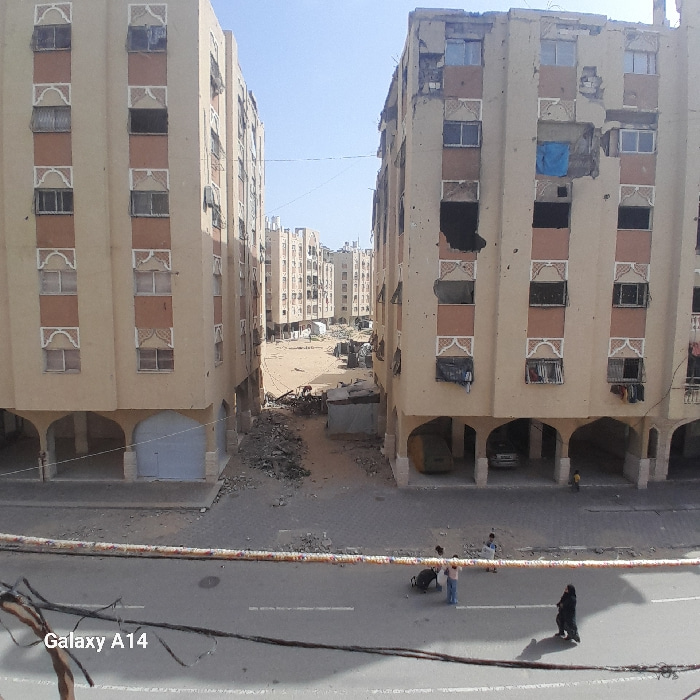 This image depicts an urban scene in Khan Yunis, Palestinian Territory, characterized by significant structural damage. In the foreground, an asphalt road features white lane markings. Overhead, a thi…read more