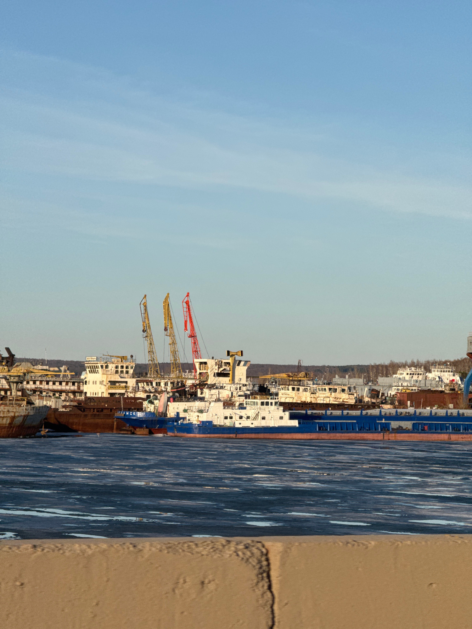 The image depicts a port scene in the city of Chaikovsky, Russia. Several ships and cranes are visible, docked along a body of water that appears partially frozen. The sky is clear and blue. A beige c…read more