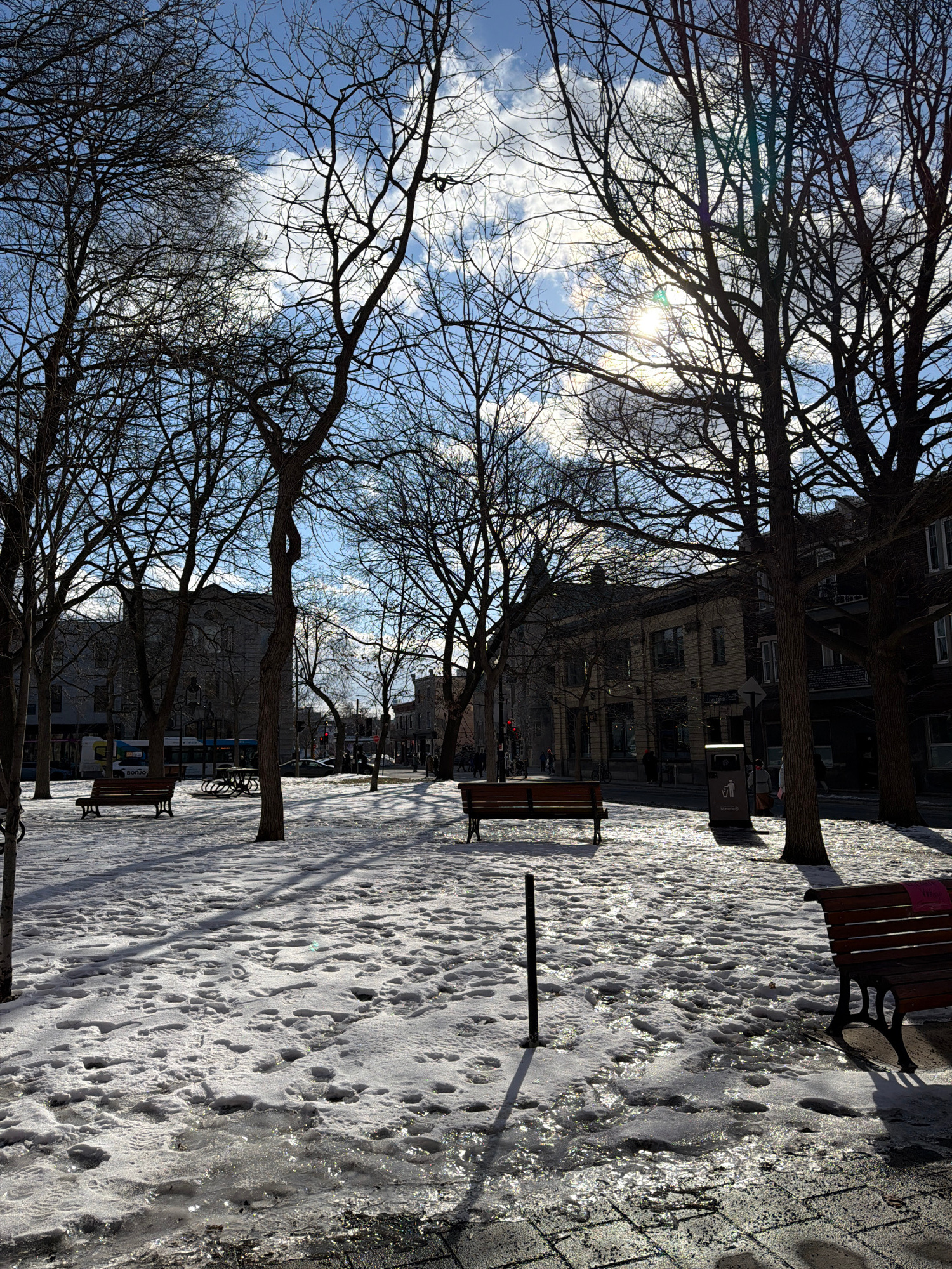 The image captures a sidewalk scene in Montreal, Canada, likely during winter, given the snowy conditions. Bare trees line the street, their branches stark against a blue sky with scattered clouds. Su…read more