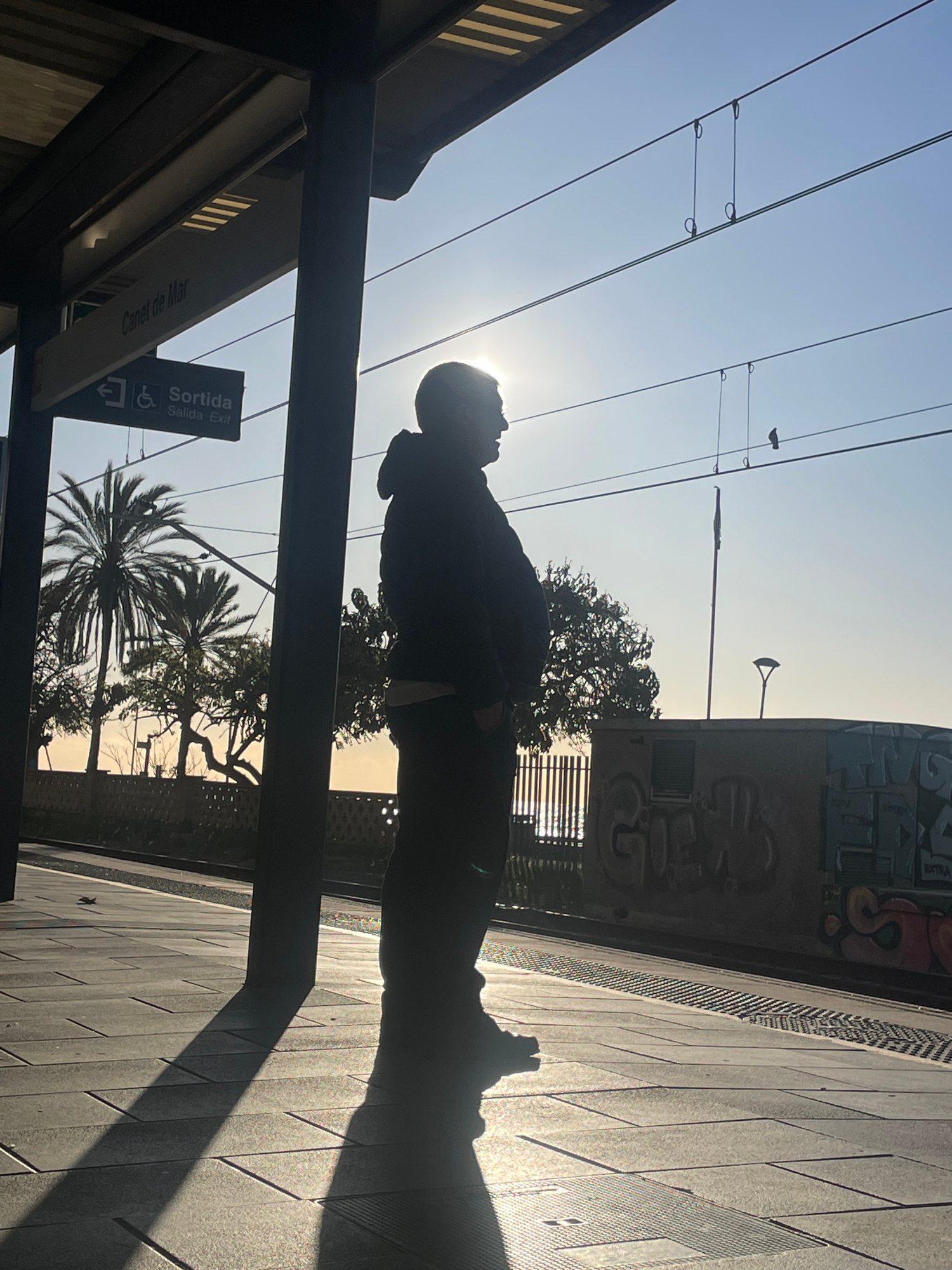 A silhouetted person stands on a patterned stone platform, likely a transit stop, near an elevated train or tram line on a sunny day. The location is Canet de Mar, Spain, evidenced by a sign reading "…read more
