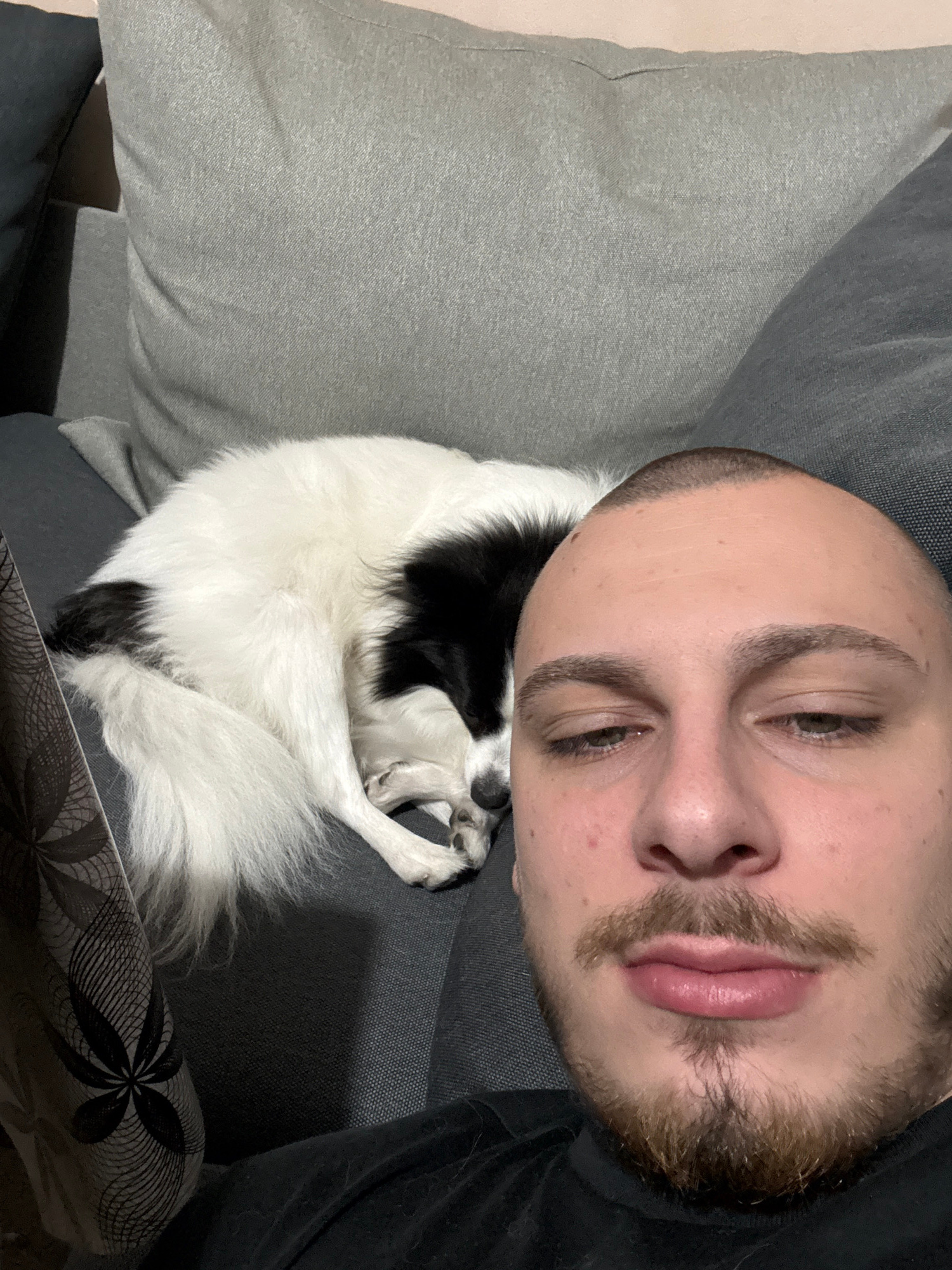 A selfie-style photograph shows a person with short-cropped hair and a beard, lying down next to a curled-up black and white dog. The person is on a gray upholstered surface, likely a couch or bed. A…read more