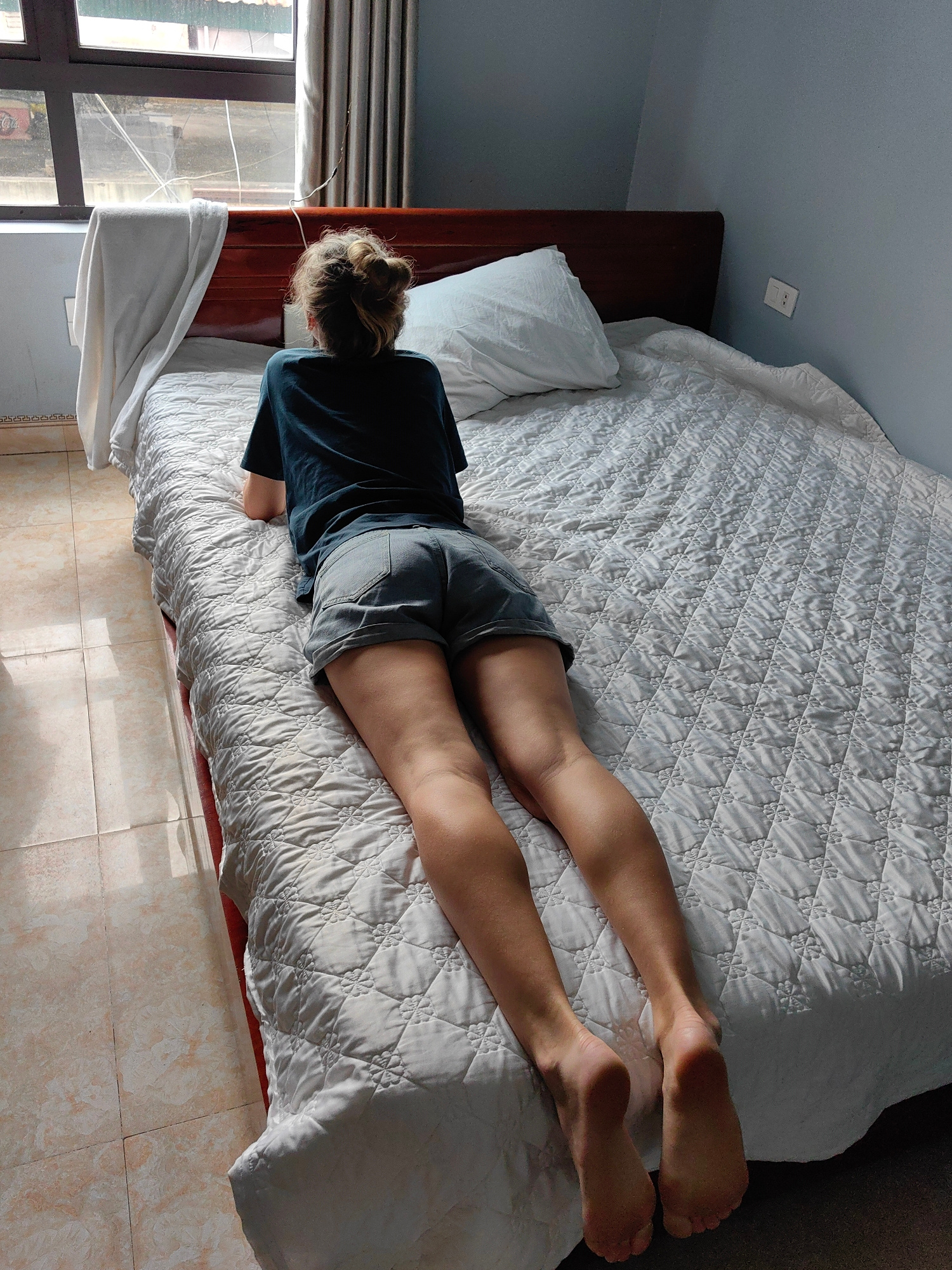 A person is lying prone on a bed in a room. The individual is wearing a dark blue t-shirt and grey shorts. Their hair is gathered in a bun. A white pillow rests on the head of the bed. The bed is cove…read more
