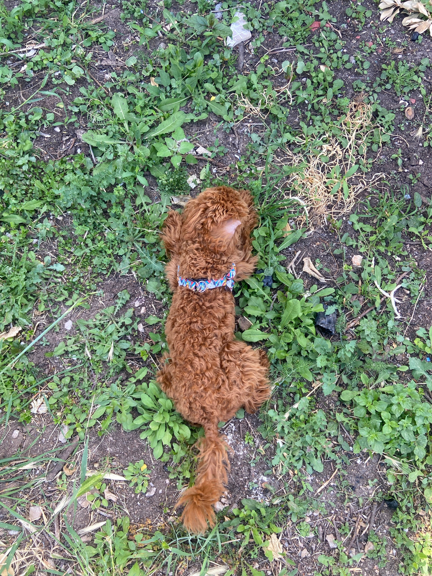 A medium, overhead shot shows a brown, curly-haired dog lying on a dirt surface with green vegetation. The dog is wearing a blue and white patterned collar. The background consists of scattered green…read more