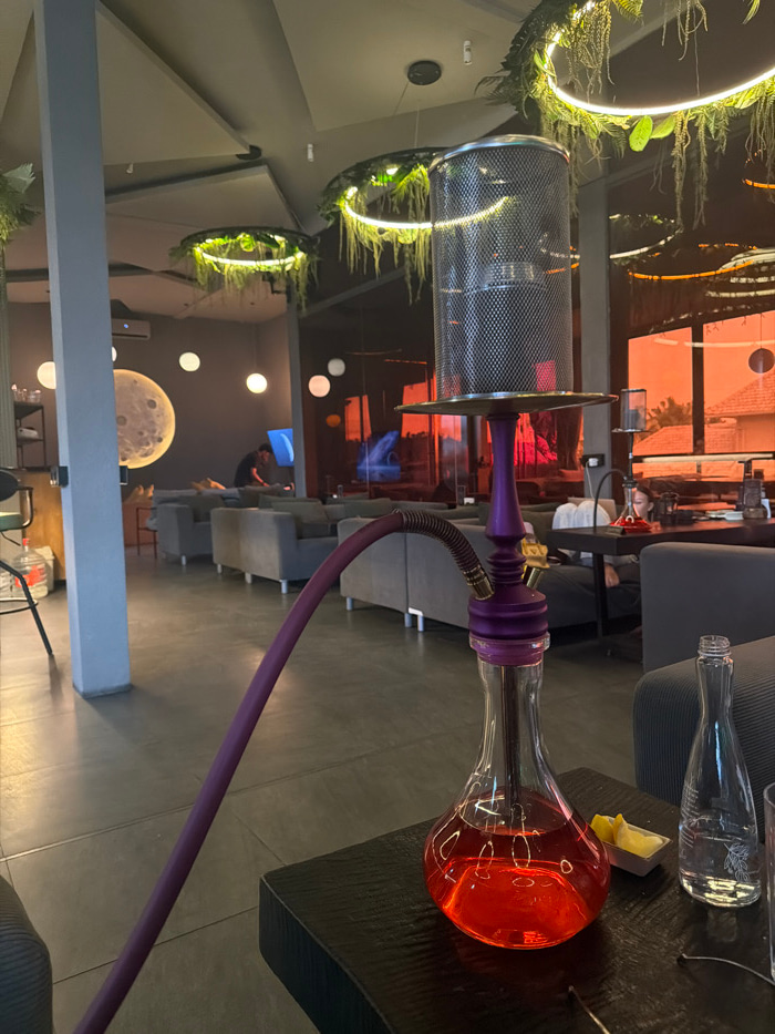 This image displays the interior of a lounge or shisha cafe, located in Tibubeneng, Indonesia, captured during evening hours. In the foreground, a shisha pipe with a purple stem, a clear glass base fi…read more