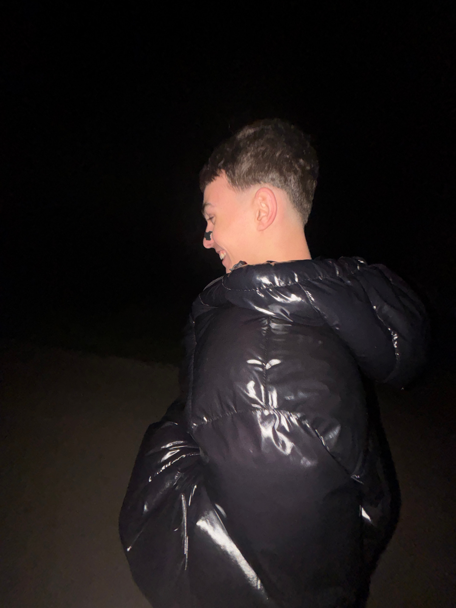 A person in a dark, shiny puffer jacket is illuminated against an otherwise dark background. The person is facing to the left and downwards, with their mouth open. They appear to have short, dark hair…read more