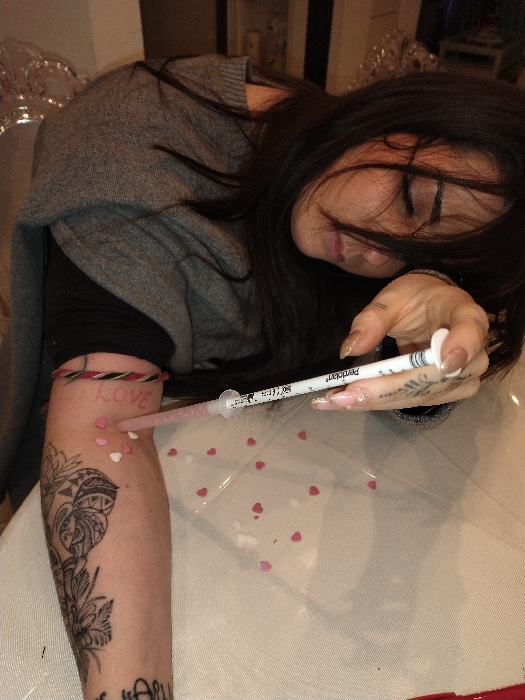 A woman in a gray sweater sits at a table, eyes closed. She holds a Periclave syringe filled with a pinkish substance. The needle pierces her arm amidst small pink and white heart-shaped candies. Tattβ¦read more