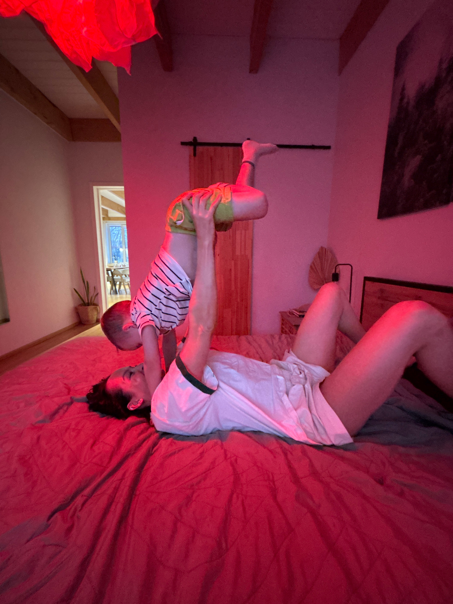 The scene depicts an adult lying on a bed covered with red sheets, interacting with a young child. The adult is positioned horizontally across the frame, wearing a white top. The child is held by the…read more