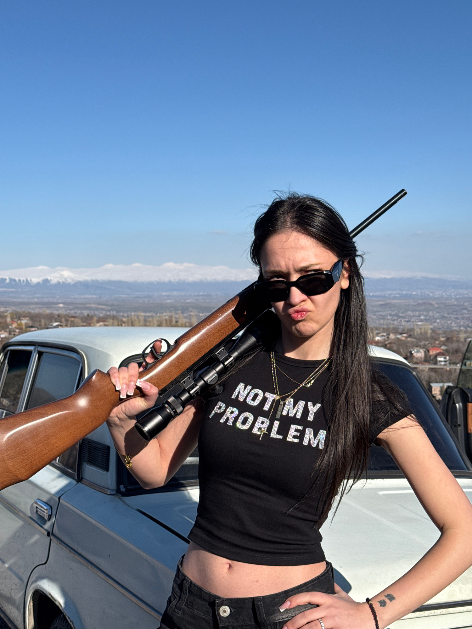 An outdoor, brightly lit, and slightly tilted portrait-style image captures a woman posing with a rifle next to a car, set against a vast mountainous landscape under a clear blue sky in Byurakan, Arme…read more