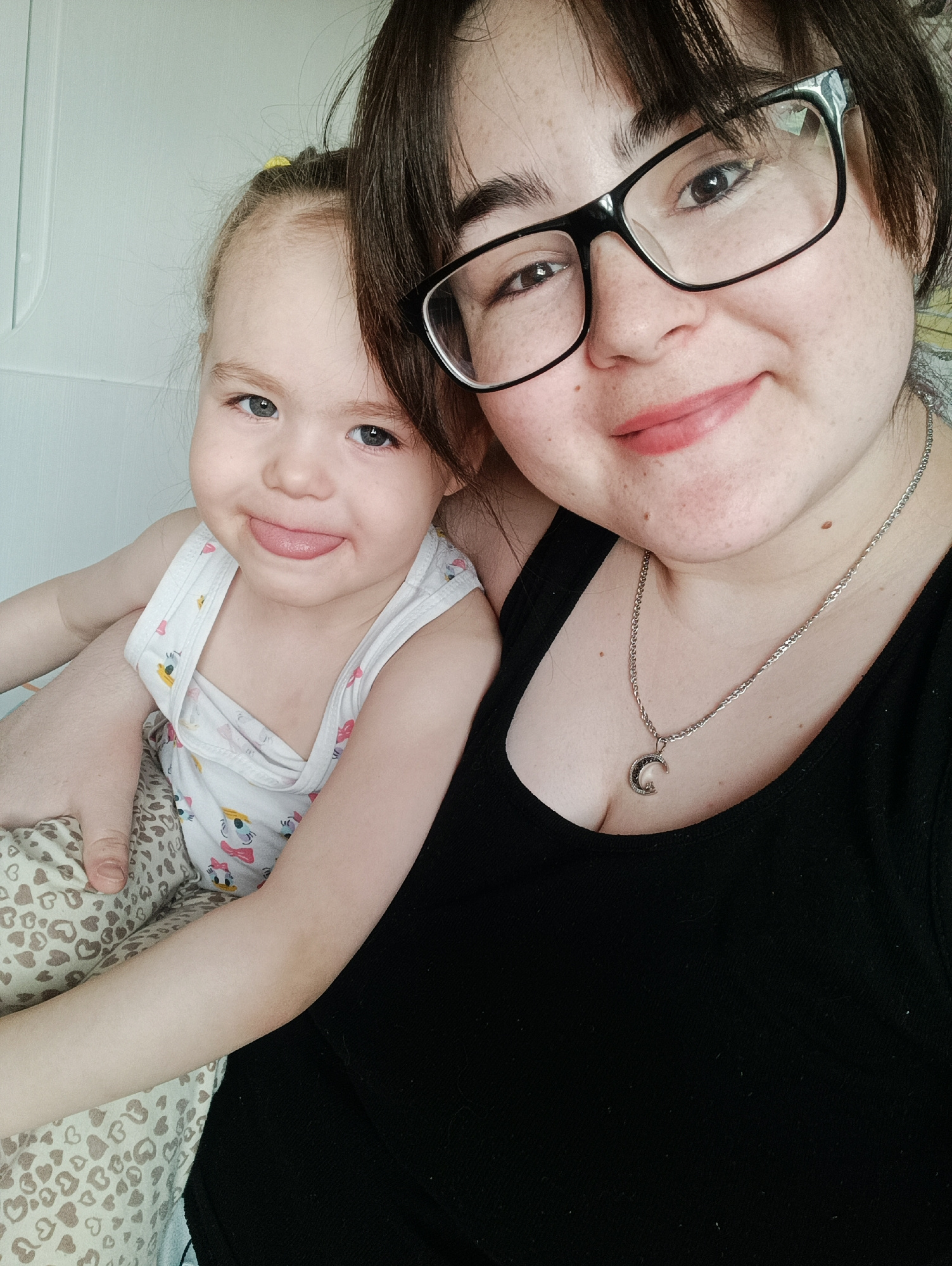 This indoor selfie captures an affectionate moment between an adult woman and a young child, likely a mother and daughter, in Noviy, Russia. The woman, positioned on the right, has dark hair, wears bl…read more