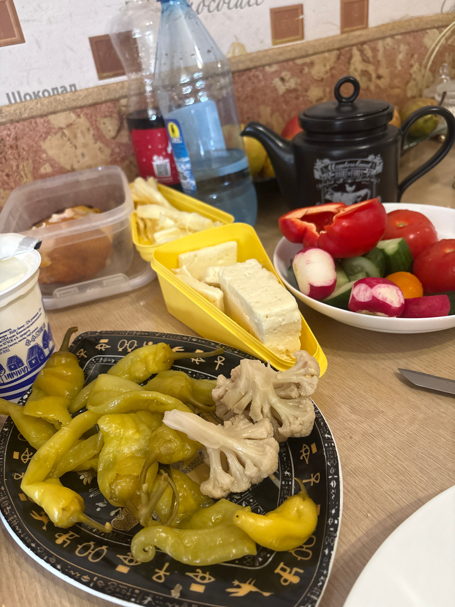 The image shows a table with various food items. There are sliced tomatoes, cucumbers, radishes, and a red bell pepper in a white bowl. There is also a yellow container with chunks of white cheese. A…read more