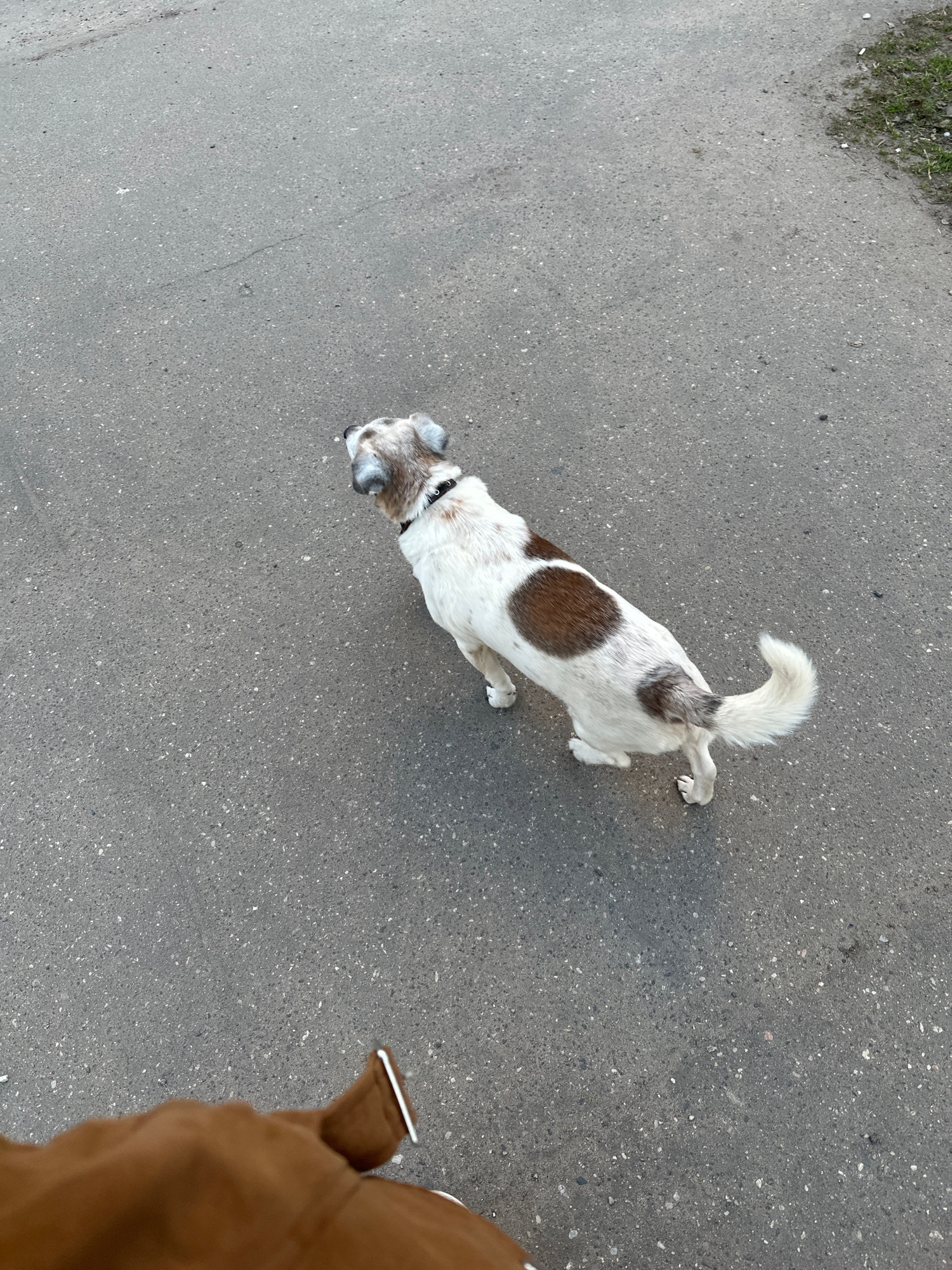 An aerial view captures a dog standing on a paved surface. The dog is predominantly white with brown markings. A person's leg is visible in the bottom right corner. The pavement appears to be cracked…read more