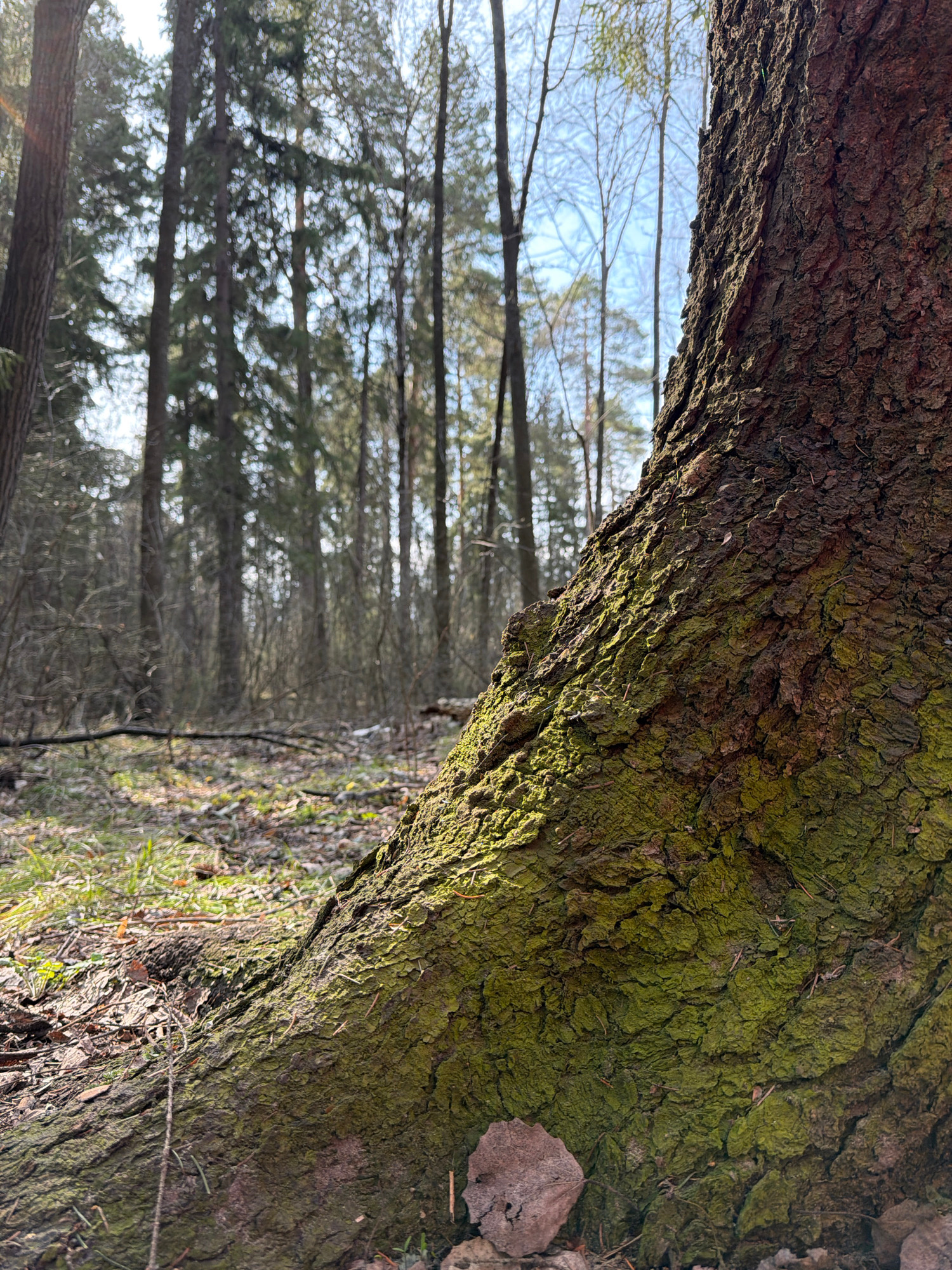 The image depicts a close-up view of the moss-covered bark of a fallen tree in a forest setting. In the background, a dense stand of trees is visible, with glimpses of the sky through the branches. Thβ¦read more