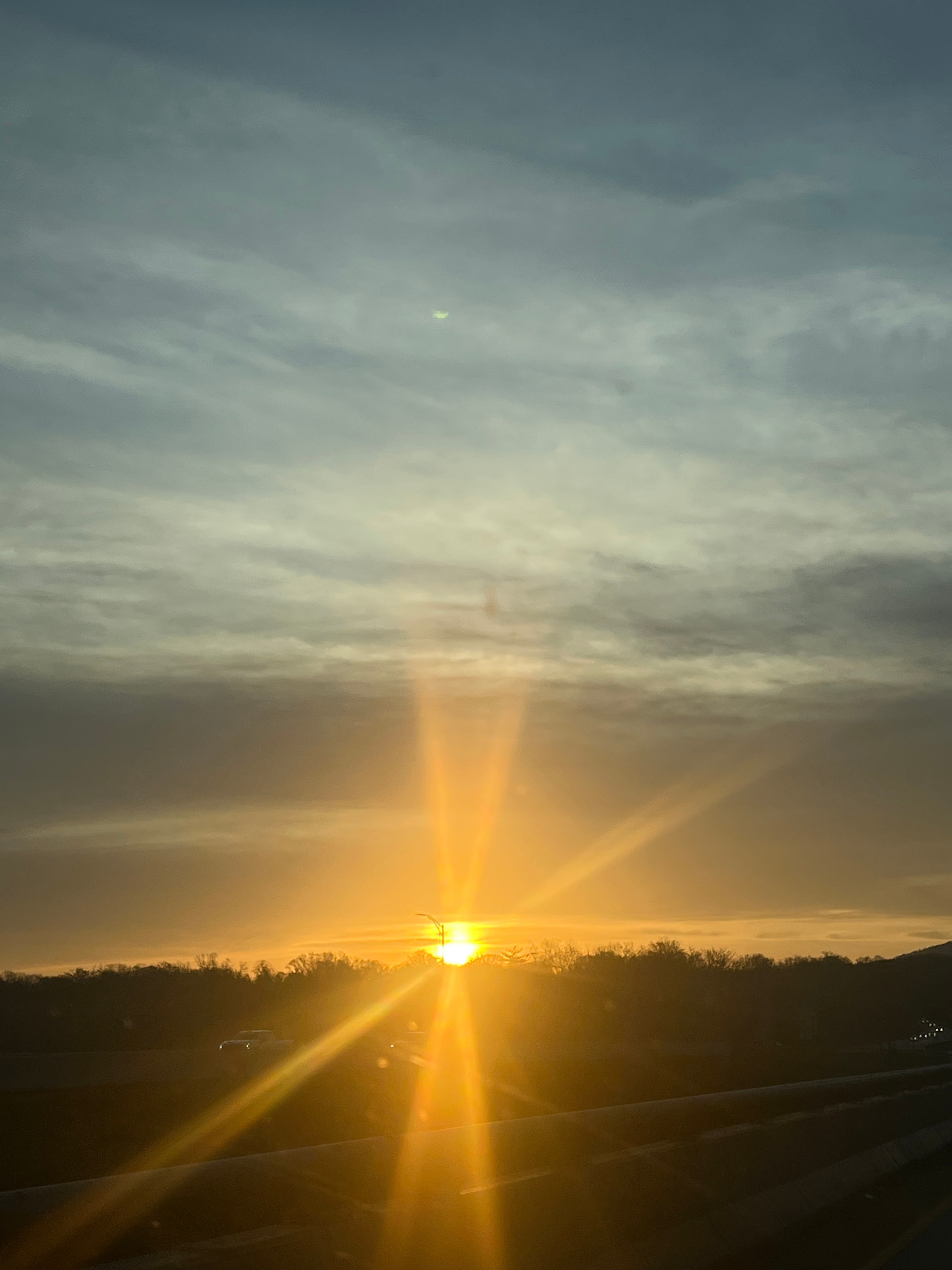 The image shows a sunrise in what appears to be a somewhat rural or suburban area. The sun is bright and low on the horizon, casting strong rays of light. Silhouetted trees are visible on one side, a…read more