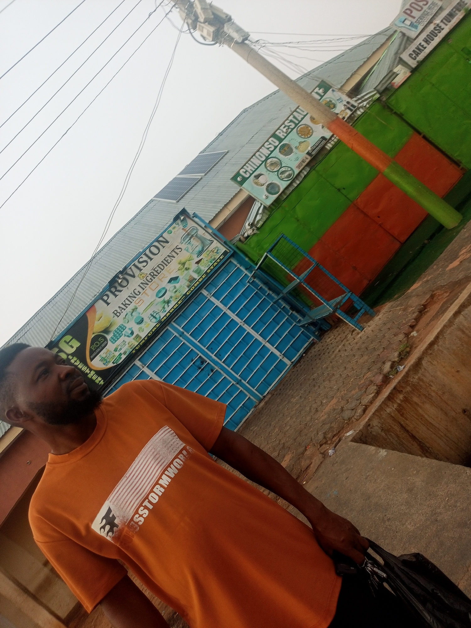 A man stands in front of a business complex in Tumfure, Nigeria. He is wearing an orange t-shirt with the inscription "SSTORMWOREA" and carrying a black plastic bag. Behind him, there are several busi…read more
