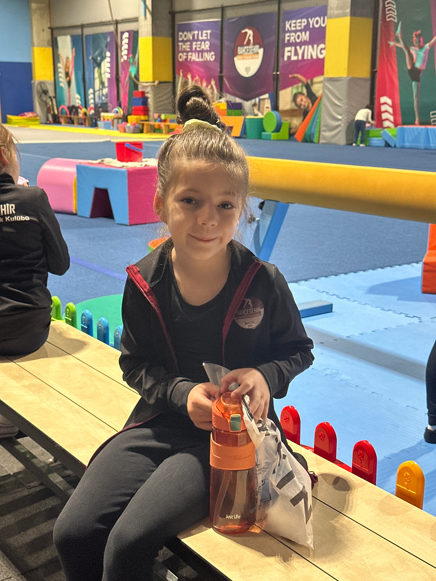 The image shows a young girl with light skin and brown hair pulled back in a bun, sitting at a table indoors. She is wearing a black jacket with red trim, and black leggings. On the table next to her…read more