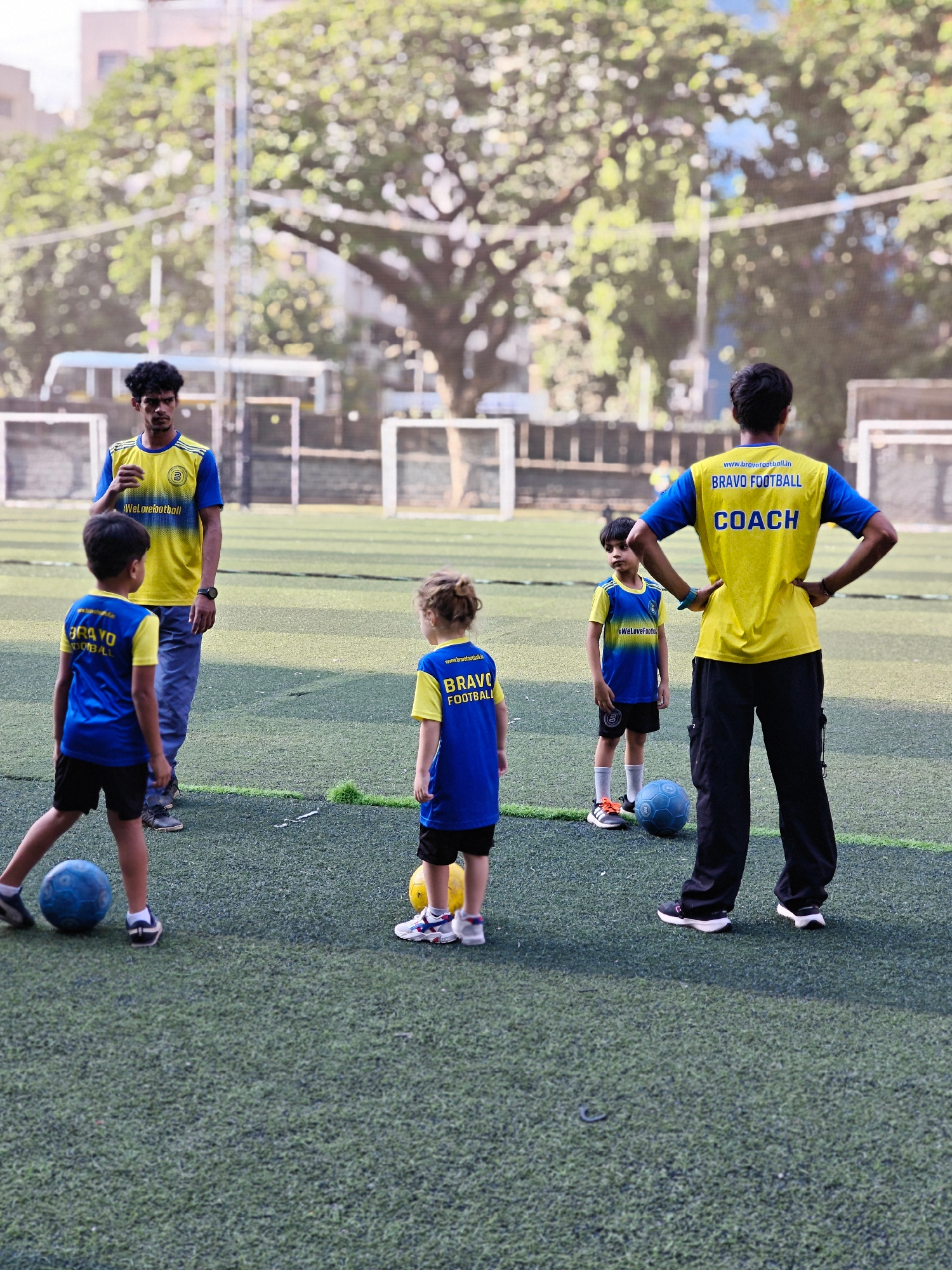 The image depicts a soccer training session on an artificial turf field in an outdoor setting. Four children are present, all wearing matching blue and yellow soccer jerseys with the words "Bravo Foot…read more