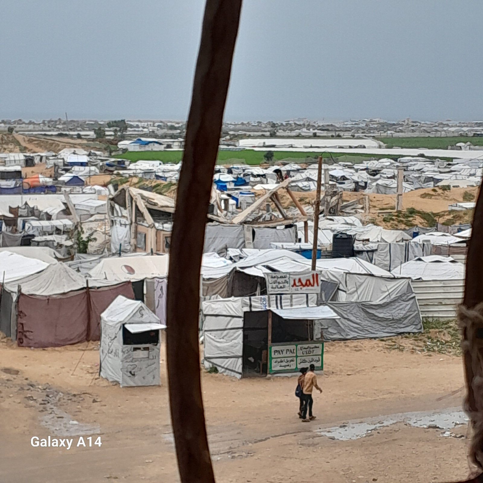 The image depicts an encampment on the outskirts of Khan Yunis, Palestinian Territory. The scene is dominated by numerous tightly packed, makeshift shelters constructed from white tarpaulin and variouβ¦read more