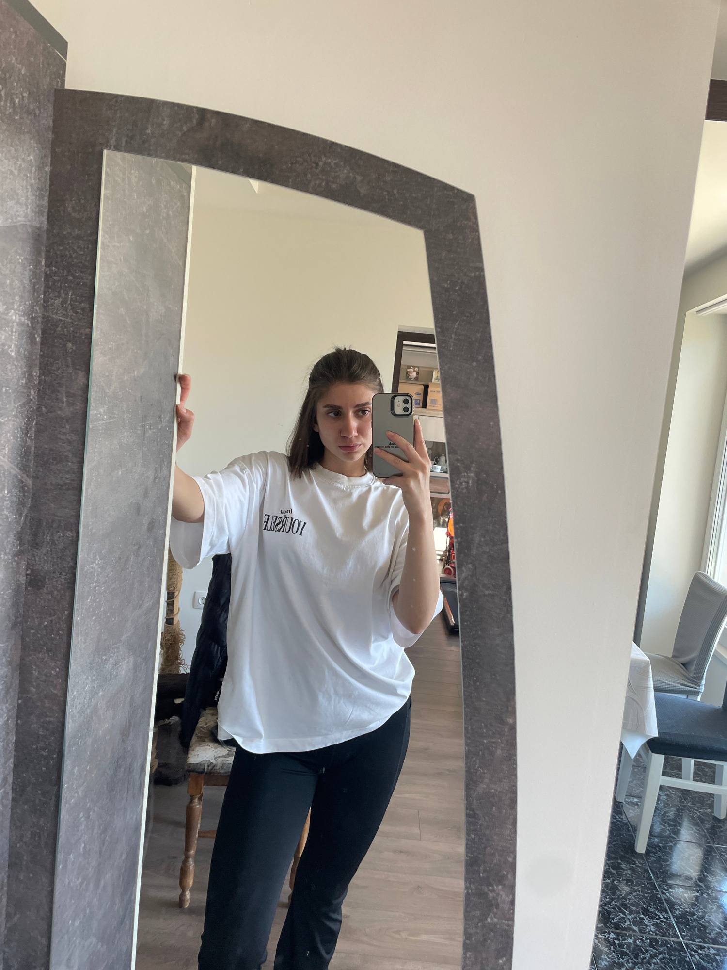 A young woman is taking a selfie in a mirror. She is wearing a white T-shirt and black pants. The mirror is framed with a gray, faux-marble material. The background shows a room with light-colored wal…read more