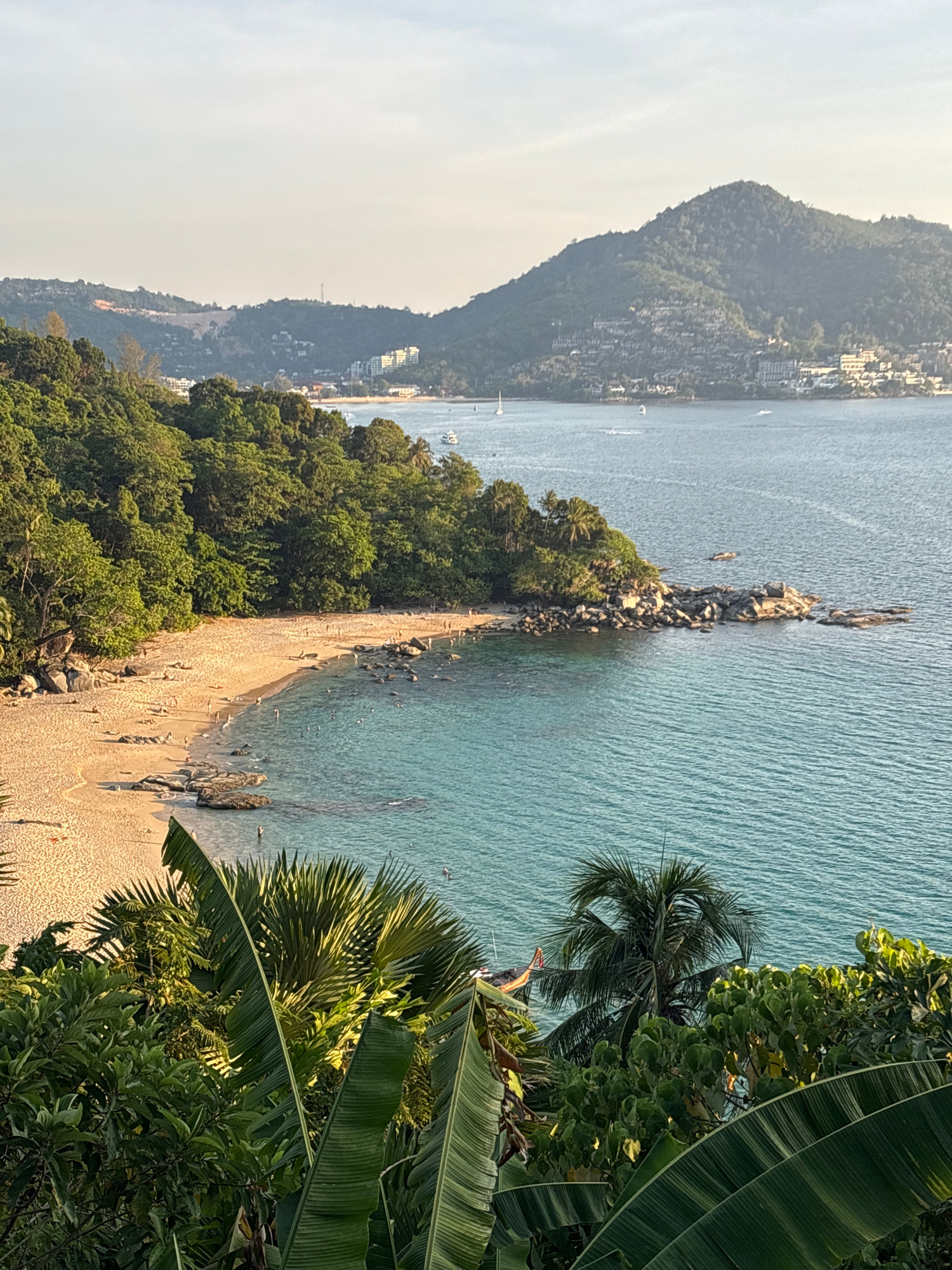 The image captures a tropical beach scene in Ban Bang Thao, Thailand. The beach is sandy with rocky areas where it meets the turquoise water. Lush green trees and foliage frame the right side of the i…read more