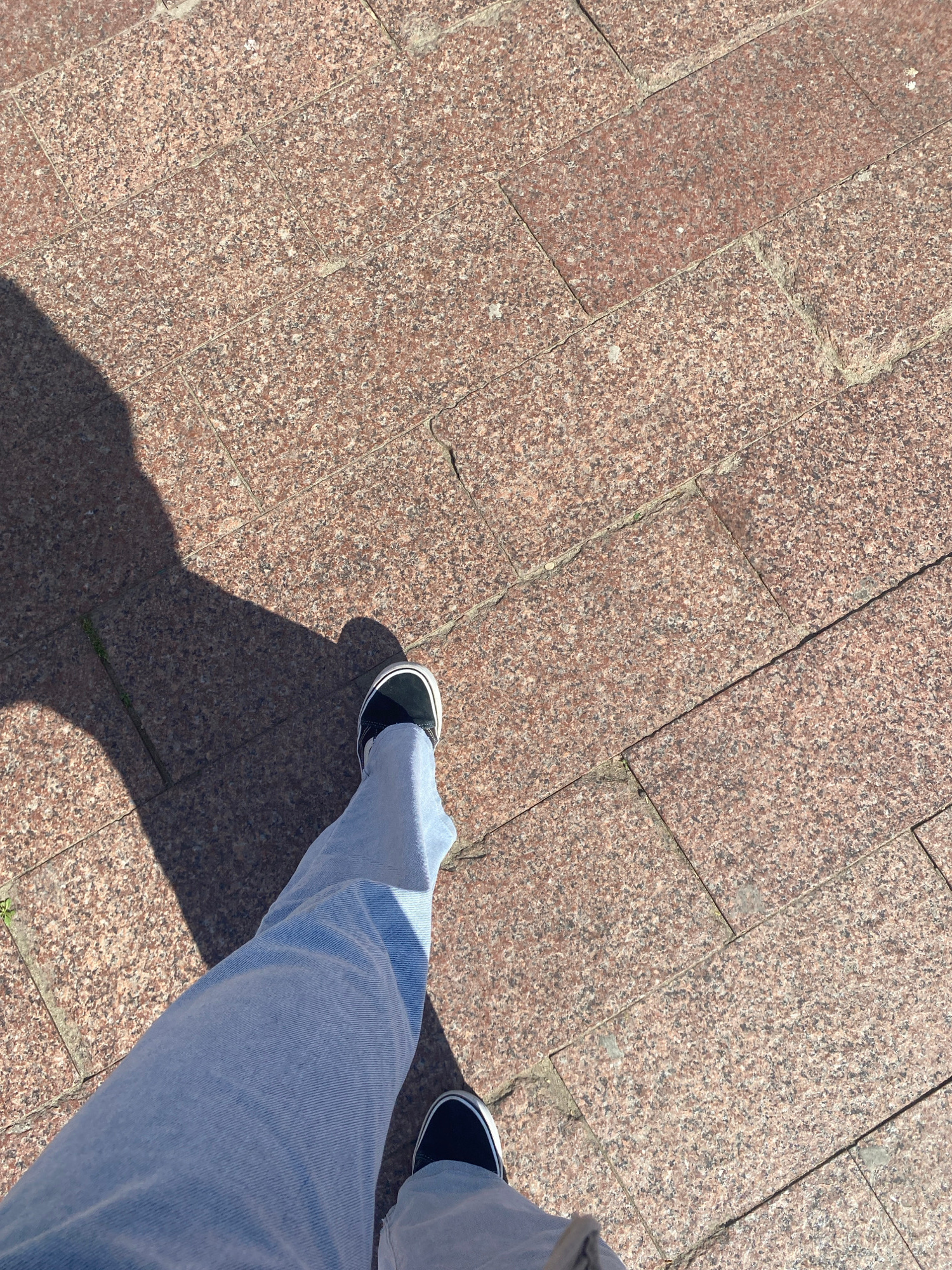 A top-down view shows a section of a pedestrian area paved with rectangular reddish-brown granite stones. Light blue denim jeans and black and white sneakers are visible on the right side of the frame…read more