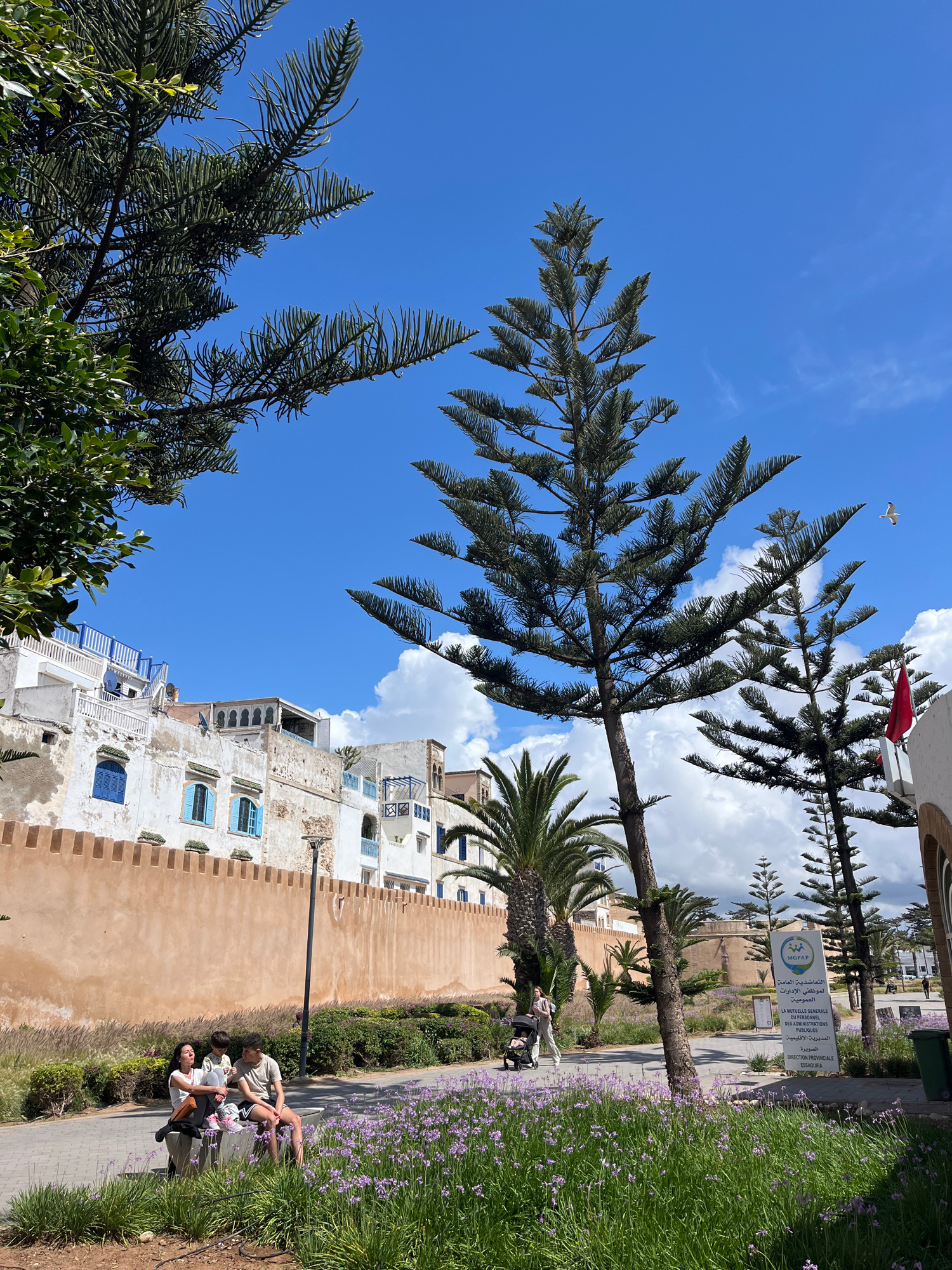 The image depicts a scene in Essaouira, Morocco. The viewpoint is low, looking upwards, with trees dominating the foreground, particularly a pine-like tree with clusters of dark green needles againstβ¦read more