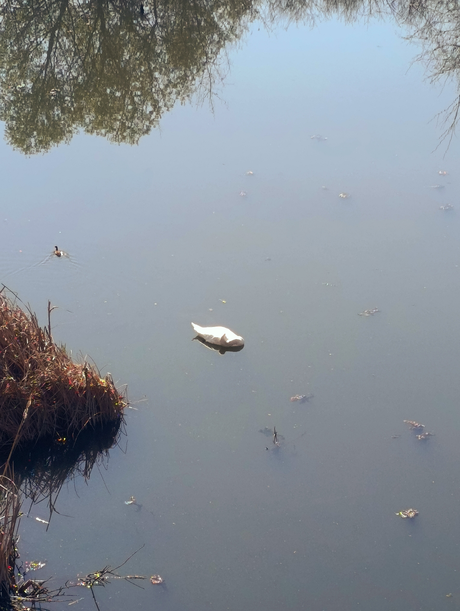 The image depicts a pond or still water body with a duck swimming in the upper left quadrant. A large white object, possibly a plastic bag or a dead animal, floats in the center of the pond. There is…read more