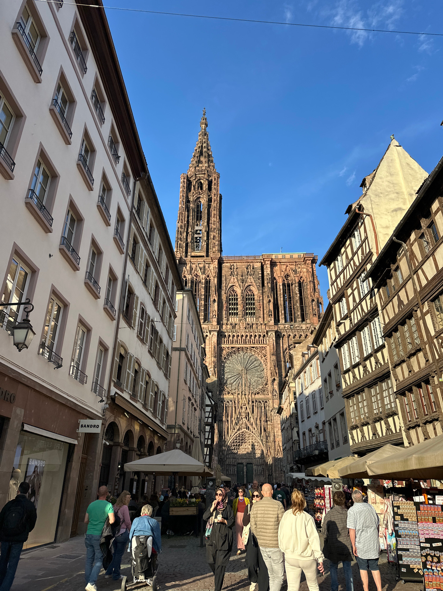 The image captures a street scene in Strasbourg, France, dominated by the imposing Strasbourg Cathedral in the background. The cathedral's intricate facade and spire are prominently displayed. Flankin…read more