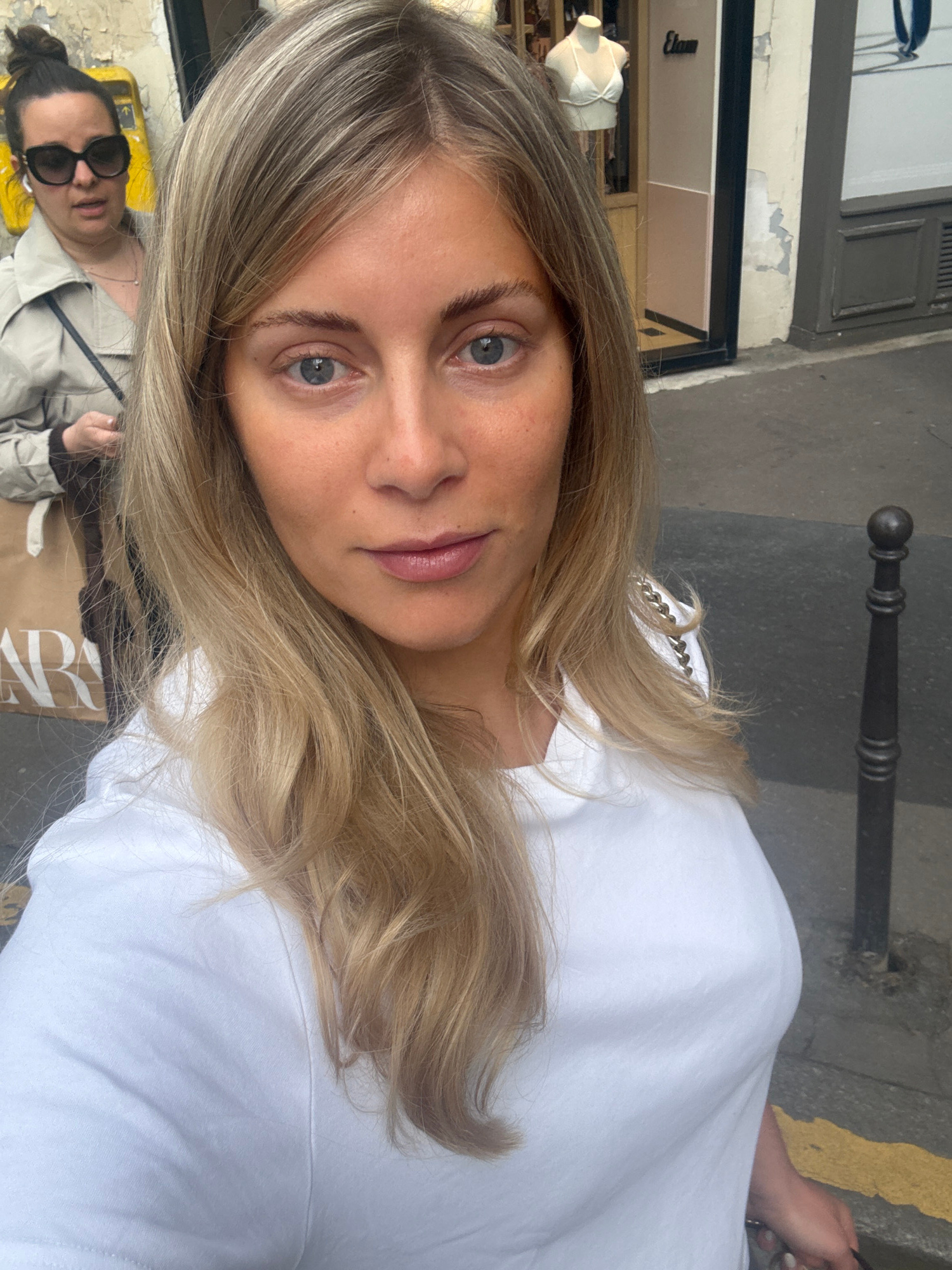 The image is a selfie taken in Paris, France. A blonde-haired woman with blue eyes is the main subject, wearing a white t-shirt. In the background, a person wearing sunglasses and a light jacket is vi…read more