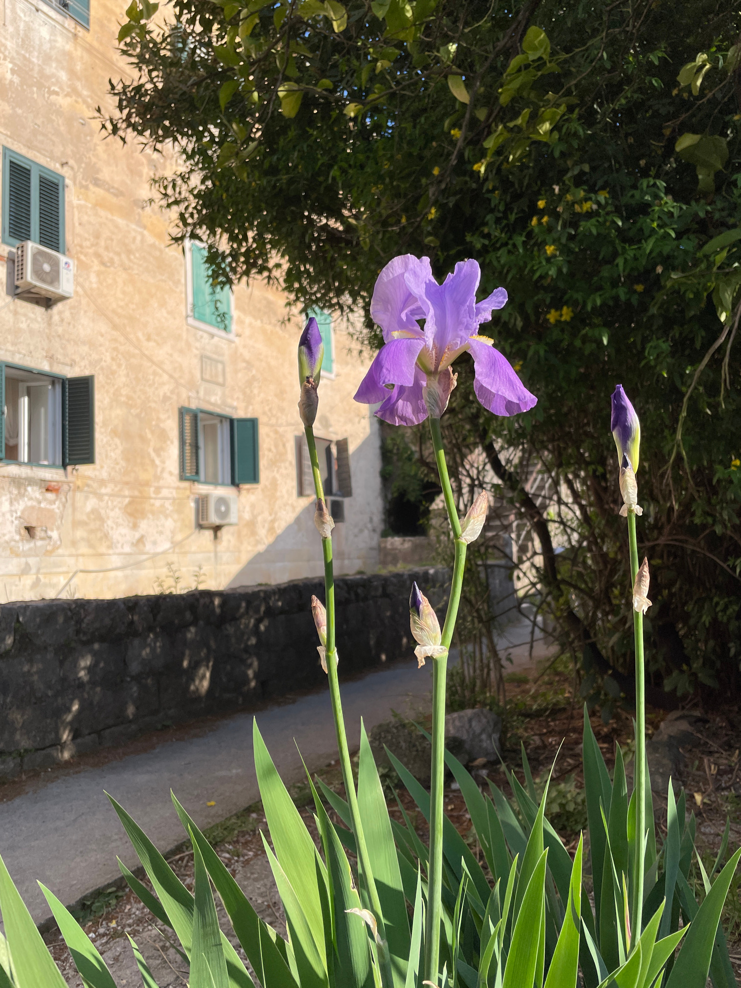A close-up, sideways view features a purple iris in bloom, alongside buds and broad green leaves. The plant stands against a backdrop of an old, light-yellow building with green-shuttered windows and…read more