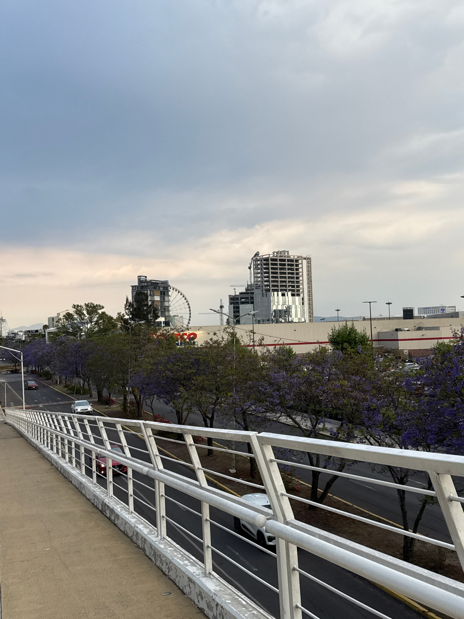 The image shows a view from an elevated vantage point, possibly a bridge or high building, overlooking a street in the city of Puebla, Mexico. The sky is overcast. A white metal railing is prominent i…read more