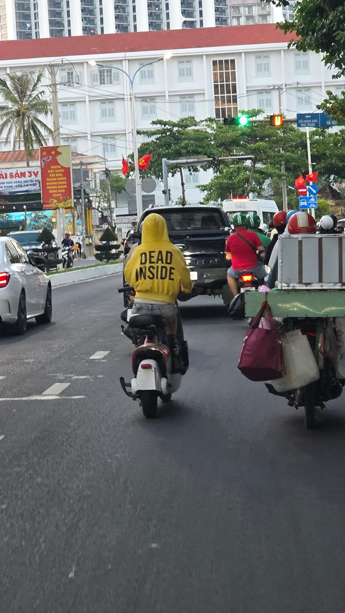 The image, taken in Nha Trang, Vietnam, shows a street scene with vehicles and people. The focal point is a person on a scooter wearing a yellow hooded jacket with the words "DEAD INSIDE" printed on t…read more