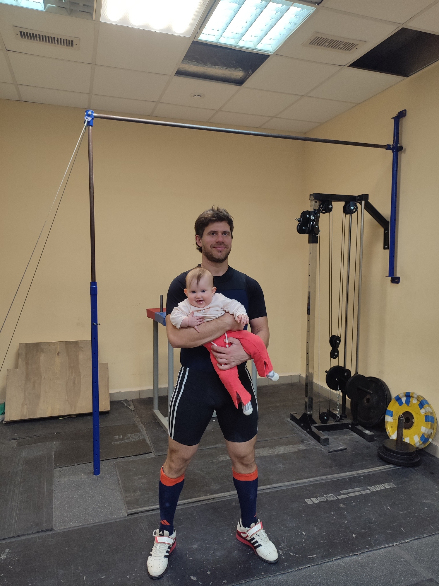 A man holds a baby in a weight room in Izhevsk, Russia. The man is fair-skinned with brown hair and a short beard, wearing a dark blue shirt, black shorts with white stripes, and long dark blue socks…read more