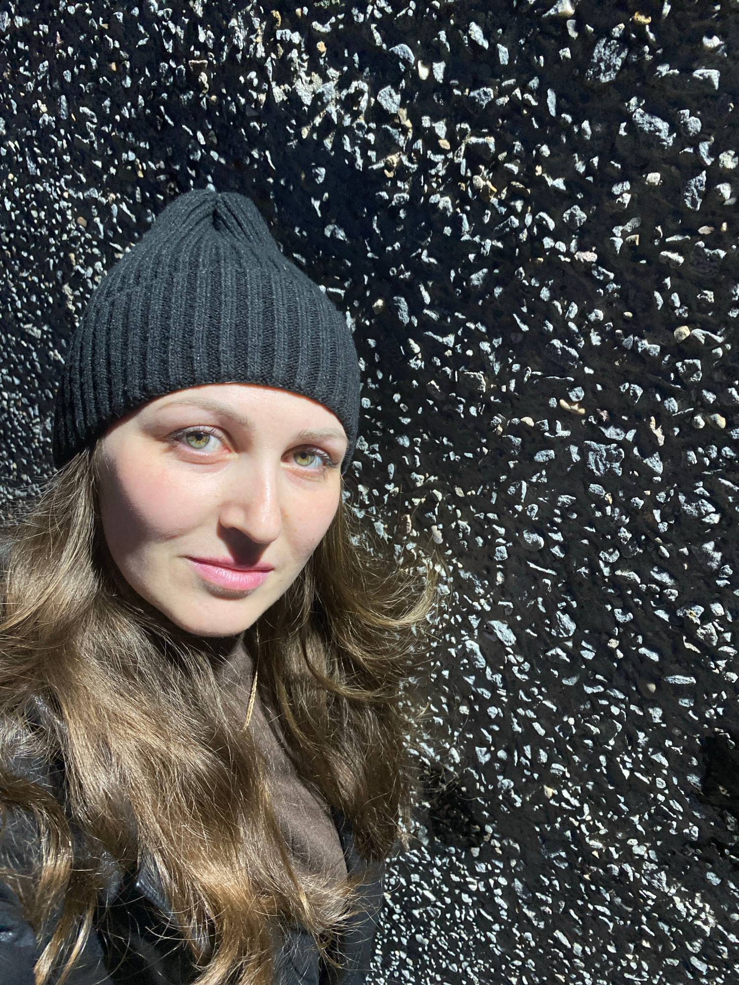 A person is lying on a surface covered with small rocks and asphalt in Марковский, Russia. The person is wearing a dark gray beanie and brown clothing. They have long, light brown hair and fair skin.…read more