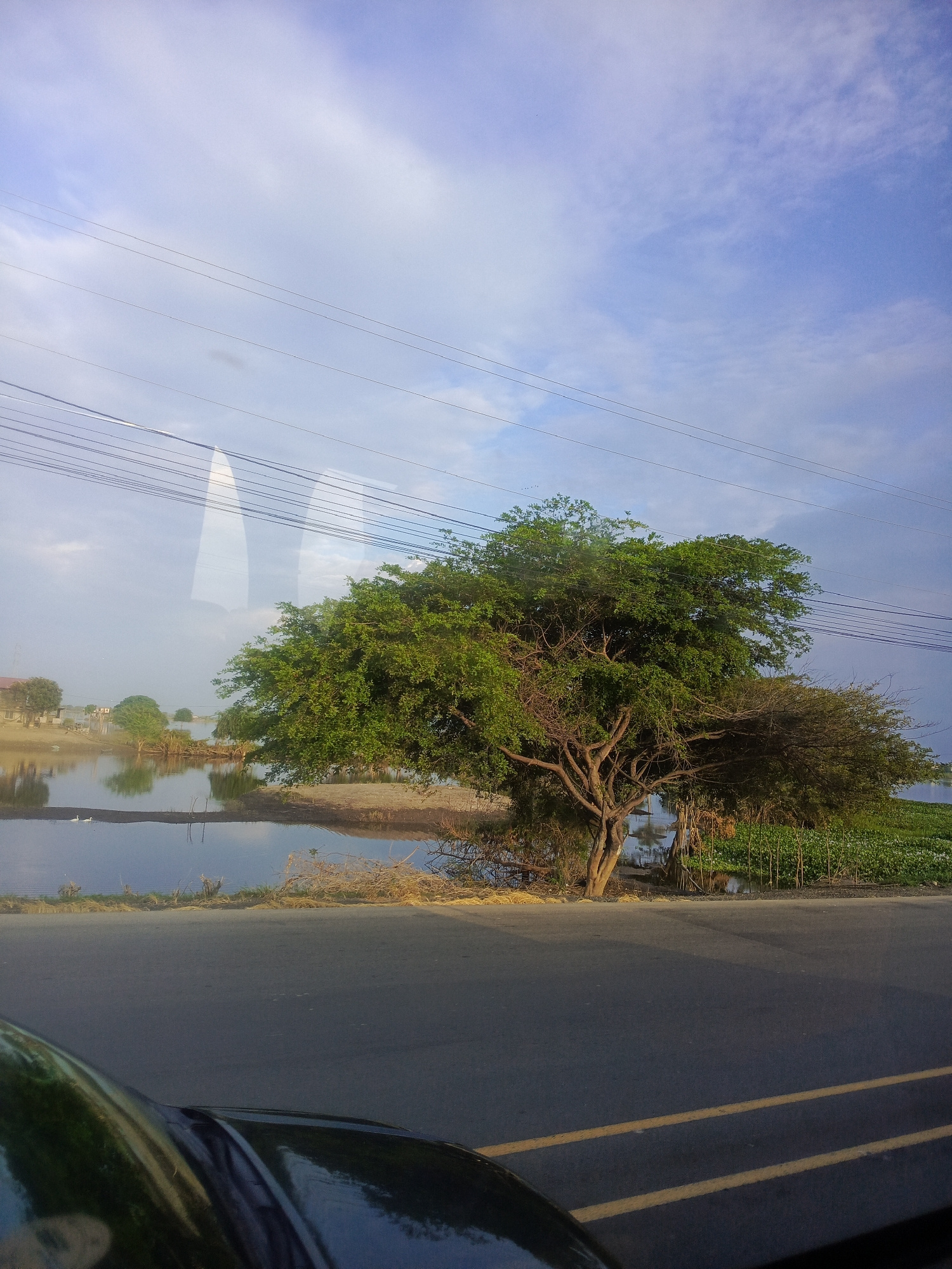 The image shows a view of a landscape from inside a vehicle, likely a car, with a portion of the vehicle's hood visible in the lower part of the frame. A paved road runs horizontally across the foregr…read more