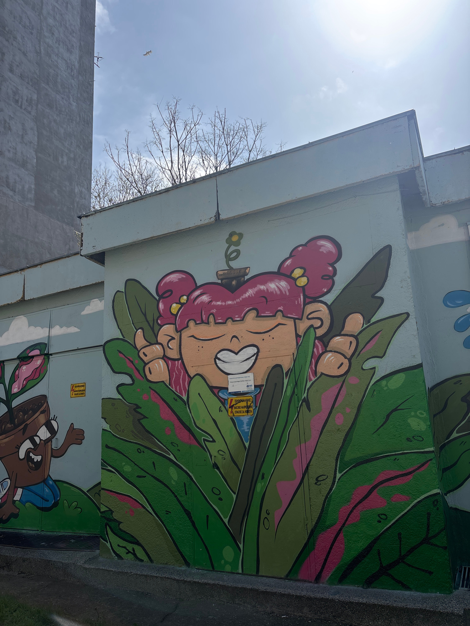 The image captures a section of a concrete structure, possibly a bridge or overpass, adorned with vibrant graffiti art in Varna, Bulgaria. The dominant mural features a cartoonish girl with pink hair…read more