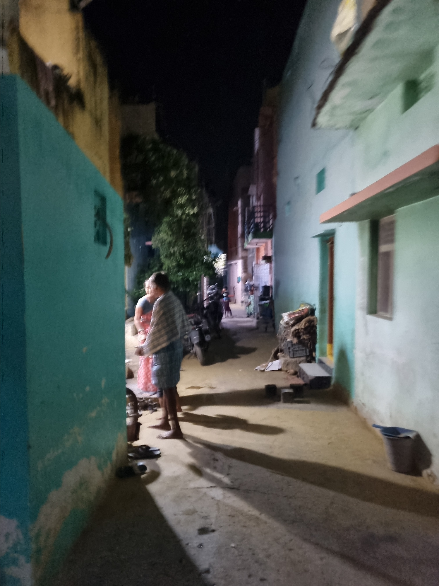 A man stands outside a building at night. The man is near a blue wall. There are shoes and other objects near his feet. A motorbike is behind him. The location is Pedda Kammavaripalli, India.
