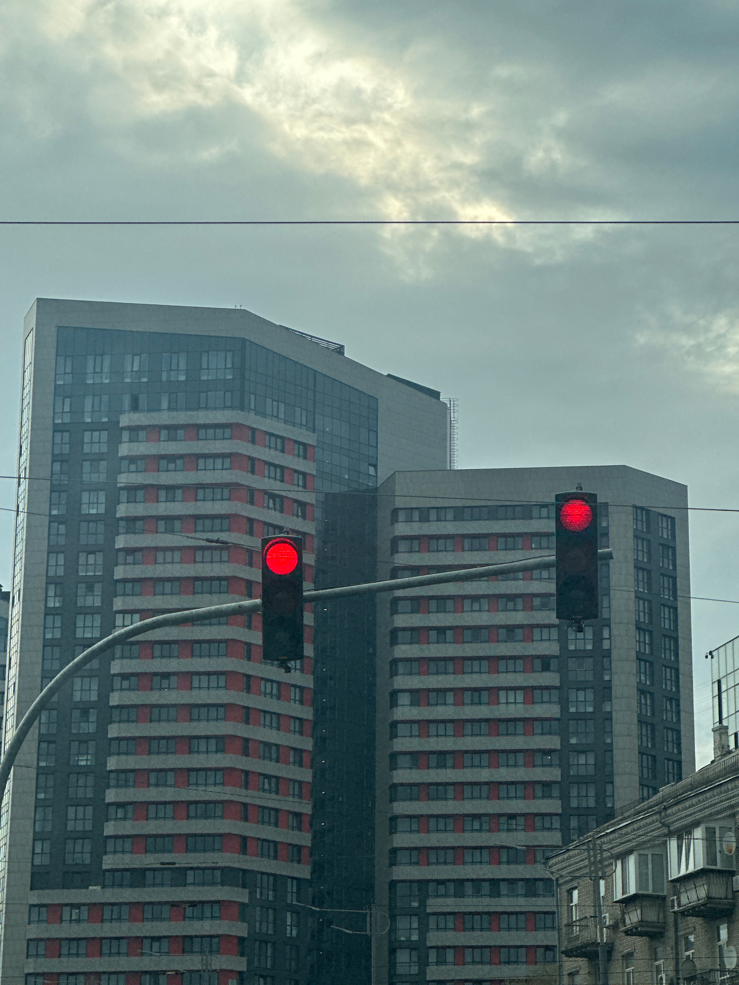 The image shows a low-angle view of two modern buildings in Kyiv, Ukraine. The buildings are tall and have a repetitive pattern of windows and red vertical stripes. A traffic light with two red lights…read more