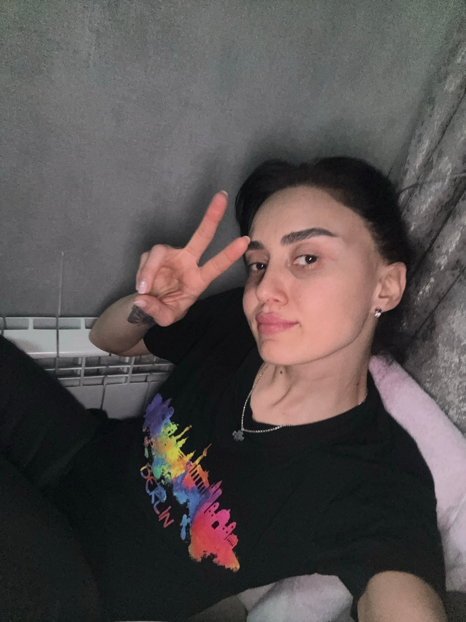 A young woman is lying on a gray floor or surface with her head resting on a light pink pillow or cushioned area. She is wearing a black t-shirt with a colorful print of the Berlin skyline and the wor…read more