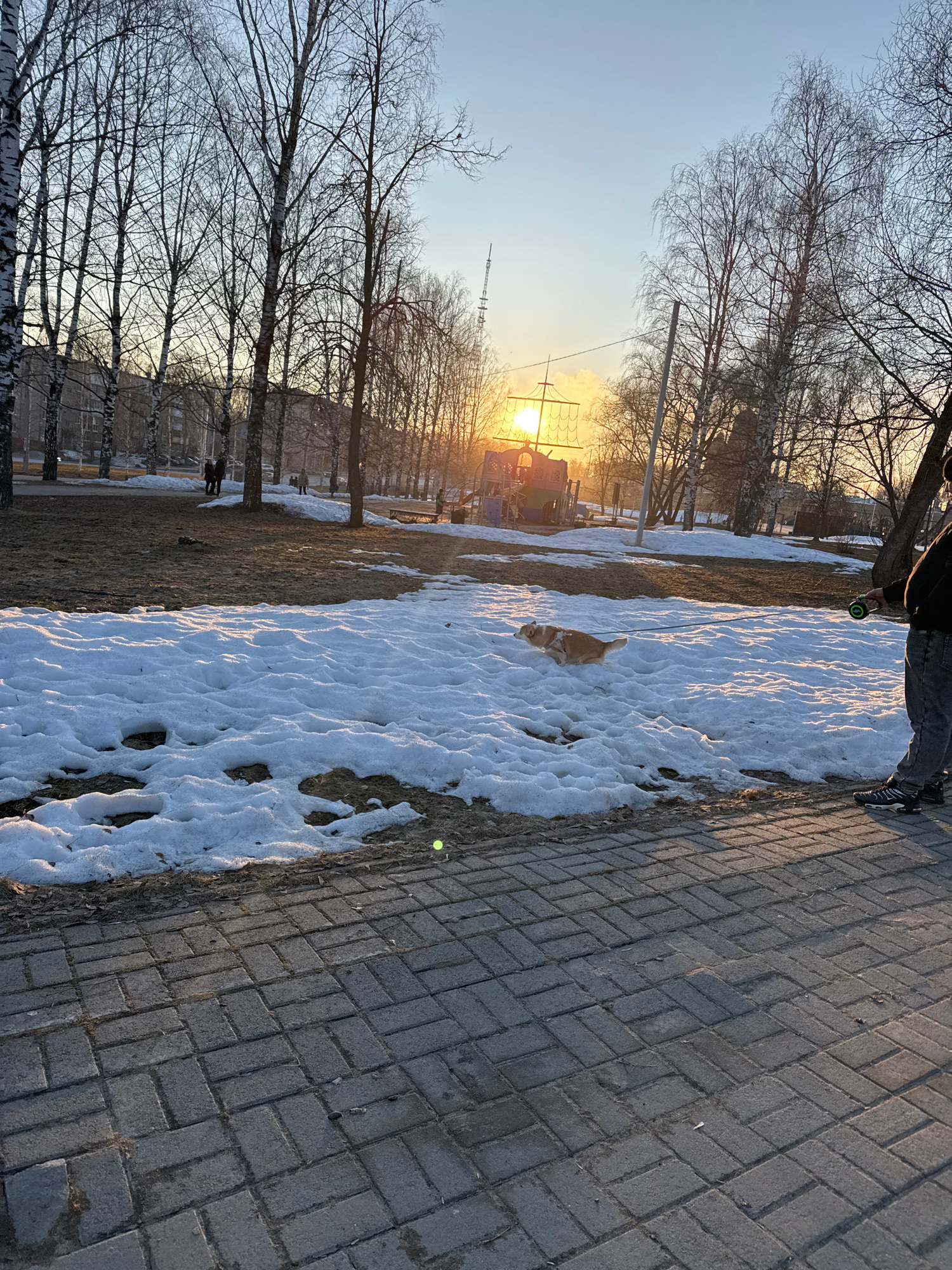 The image depicts an outdoor scene in what appears to be a park or public space, most likely located in Berezniki, Russia. The ground is covered with a mixture of snow and bare earth, suggesting a tra…read more