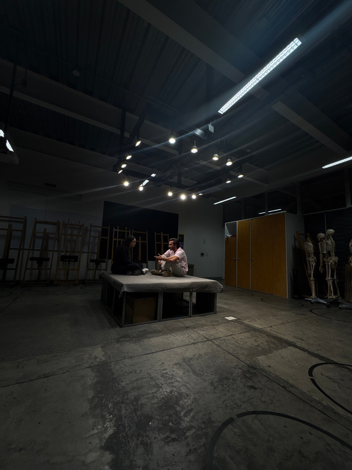A person crouches on a platform, engaged in a conversation with another person sitting below. The backdrop features a dark wall and rows of wooden chairs. Fluorescent and globe lights illuminate the s…read more
