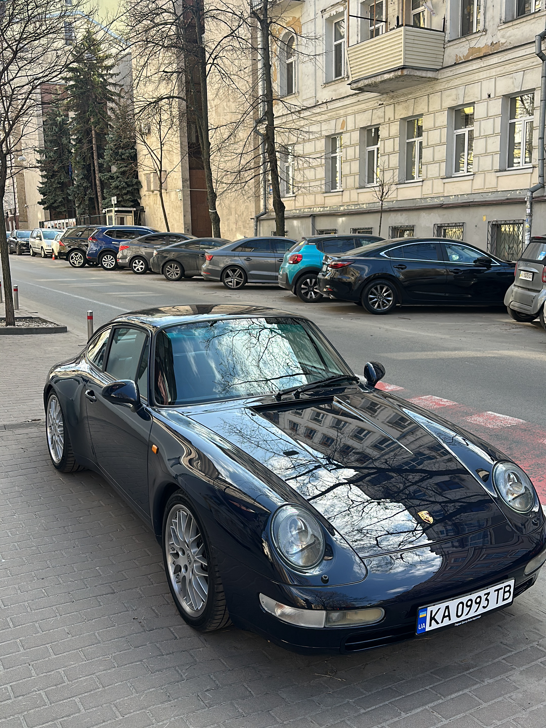 A dark blue Porsche 911 (993 generation) is parked on a grey cobblestone sidewalk in Kyiv, Ukraine. The vehicle, oriented at a front-left quarter angle, displays its silver multi-spoke alloy wheels an…read more