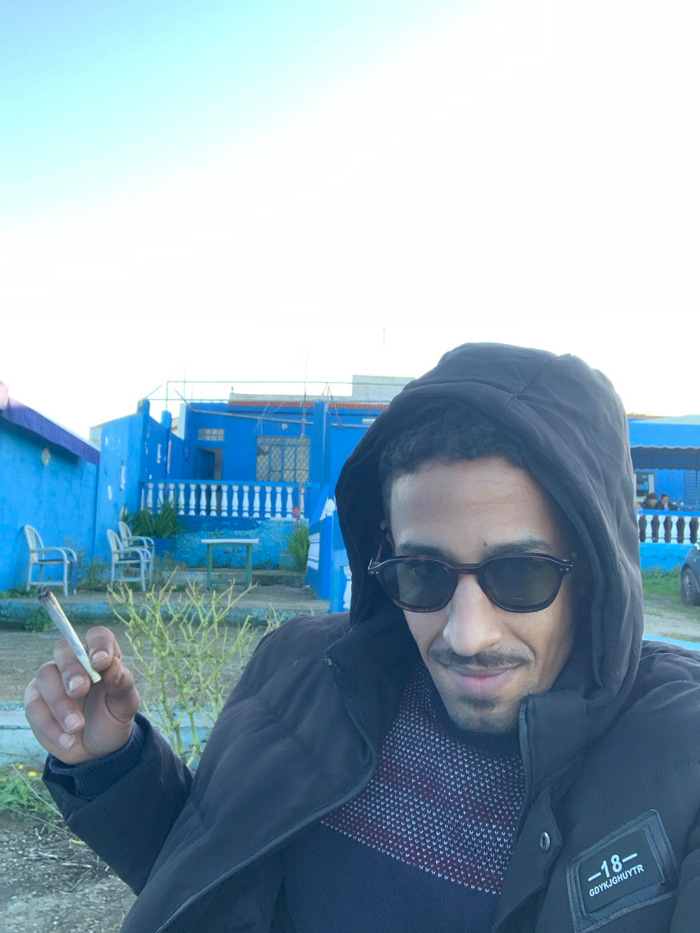 A man in a black hooded jacket and sunglasses holds a cigarette in his hand. He is positioned in front of a bright blue building with white accents, including a railing and stacked chairs. The sky isβ¦read more